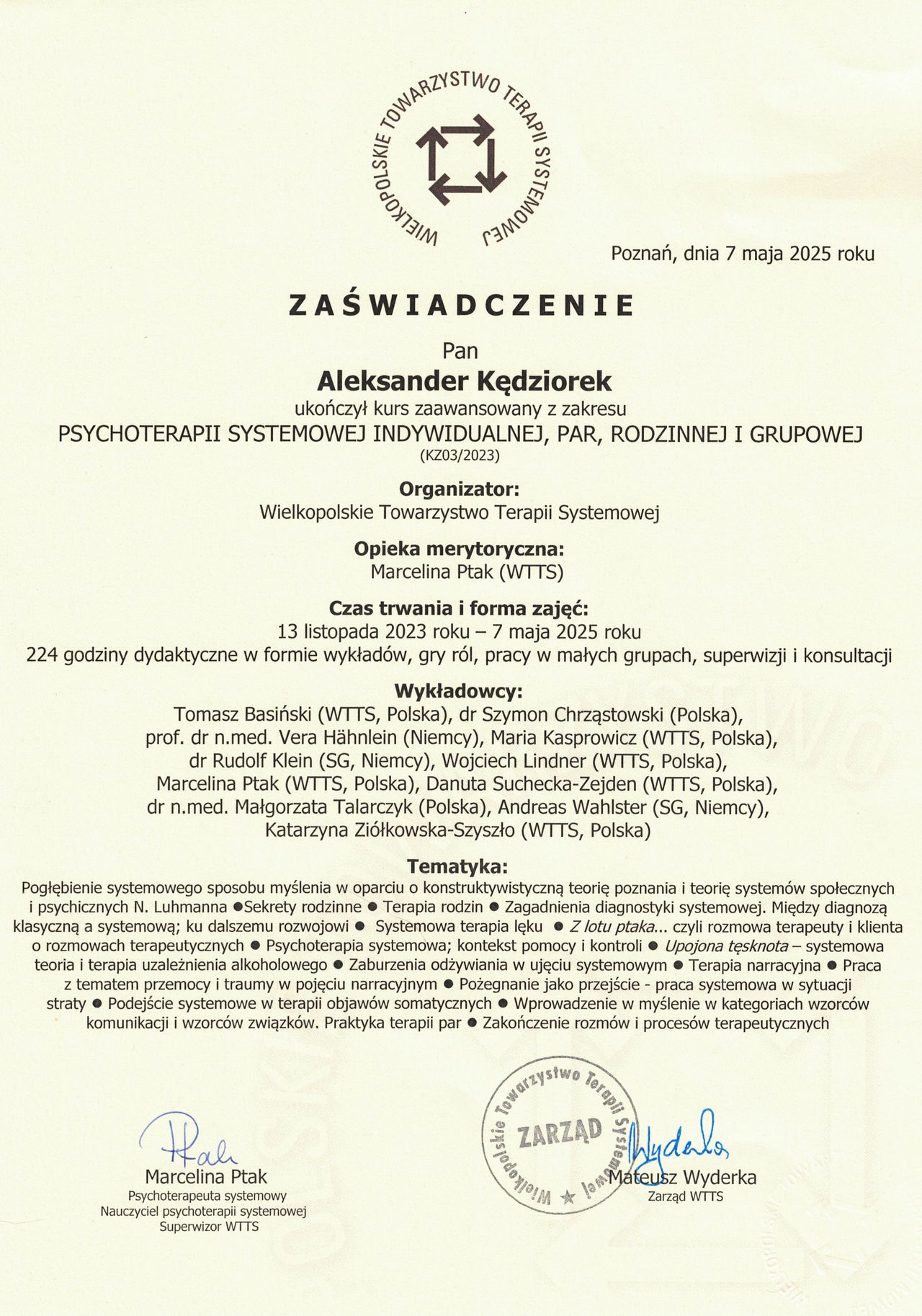 Jestem psychologiem, studia ukończyłem na Uniwersytecie im. Adama Mickiewicza w Poznaniu, przebywałem także na dwusemestralnym pobycie na Freie Universitaet w Berlinie. Ukończyłem studium podyplomowe "Psychologiczne Wspomaganie Rozwoju Dzieci i Młodzieży z Trudnościami" na Uniwersytecie Wrocławskim. Mam ukończony podstawowy kurs z logoterapii (nurt psychologii egzystencjalnej Viktora Frankla, rozwinięty w Polsce przez Kazimierza Popielskiego) - kurs akredytowany przez International Association of Logotherapy and Existential Analysis at the Viktor Frankl Institute Vienna. Ukończyłem podstawowy i zaawansowany kurs terapii systemowej w Wielkopolskim Towarzystwie Terapii Systemowej i planuję się w nim certyfikować. Poddaję się superwizji w WTTS.
