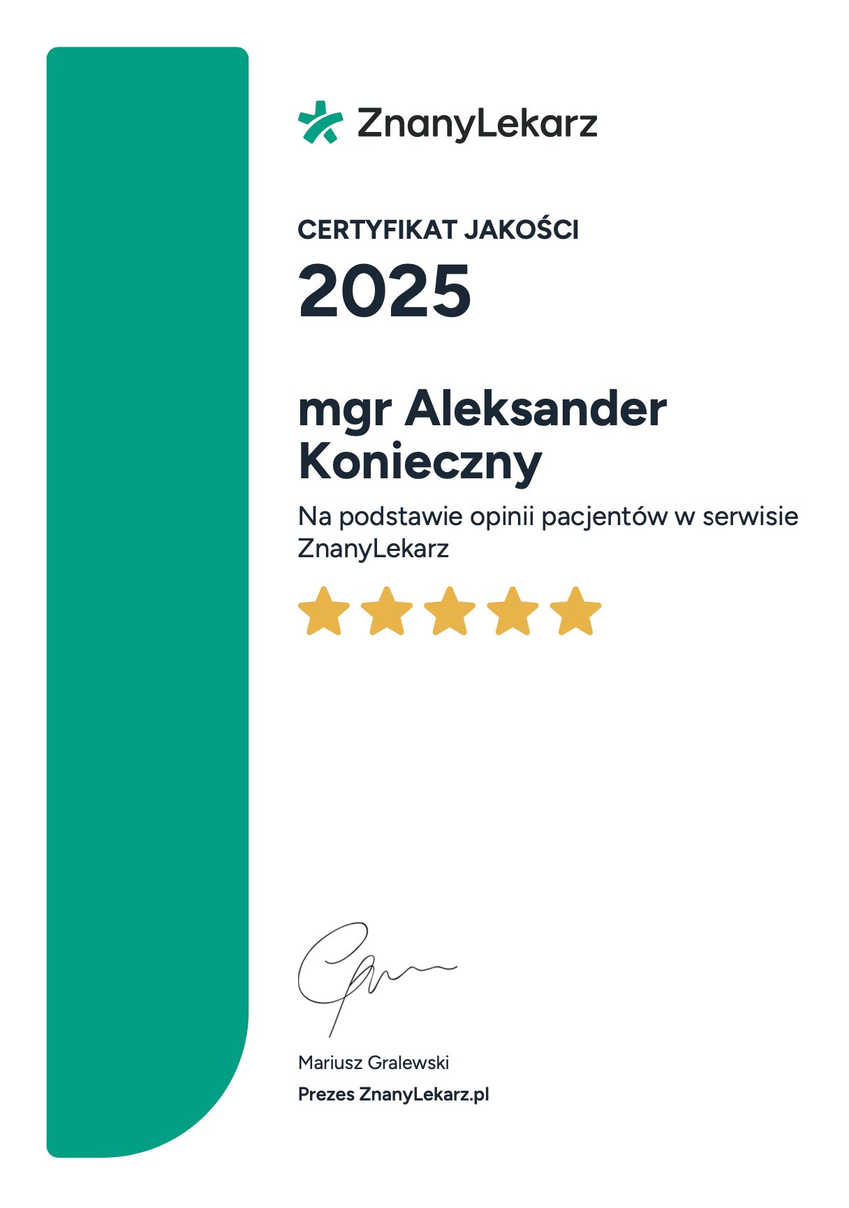 Jak Aleksander Konieczny umawia wizyty?Aleksander Konieczny używa kalendarza ZnanyLekarz, dlatego na stronie widzisz aktualne terminy. Wystarczy, że wybierzesz datę i godzinę, które odpowiadają Ci najbardziej. Umawianie wizyty jest darmowe, a tuż przed terminem wyślemy Ci przypomnienie.