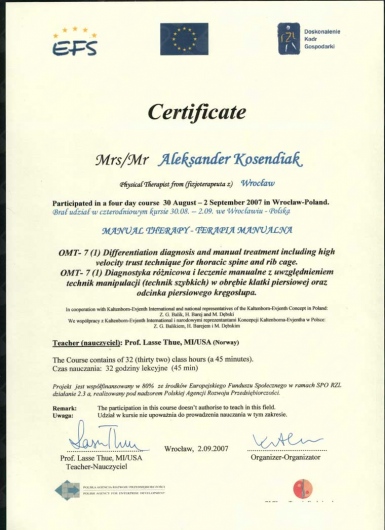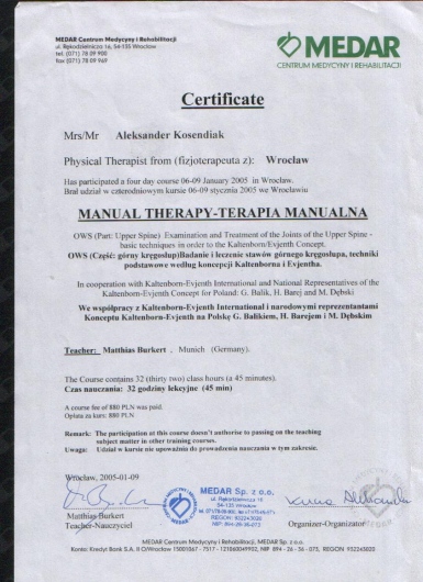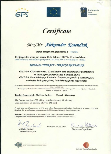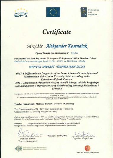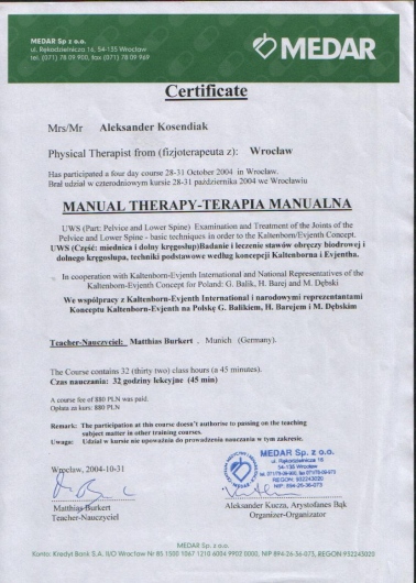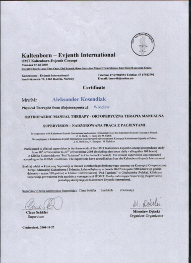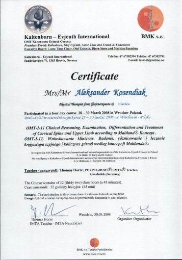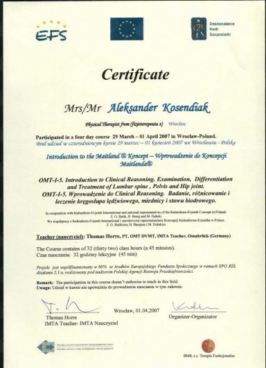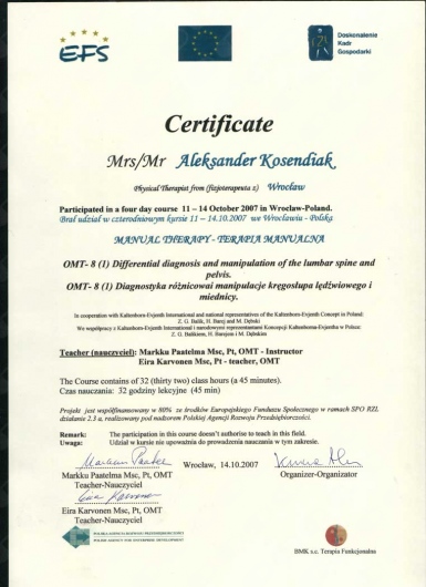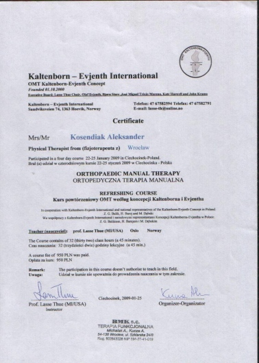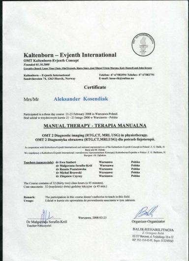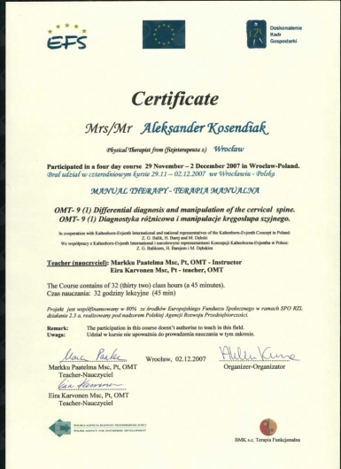 2009 - Ortopedyczny Fizjoterapeuta Manualny (OMT) - (ok. 1000 godz. szkoleń)