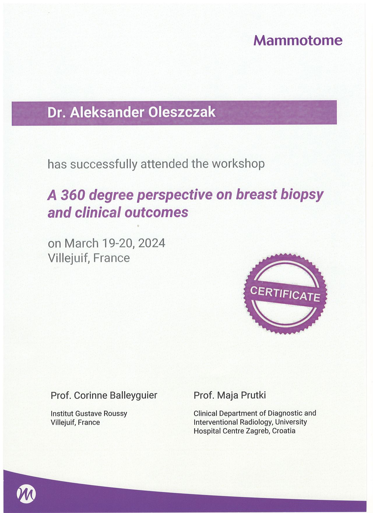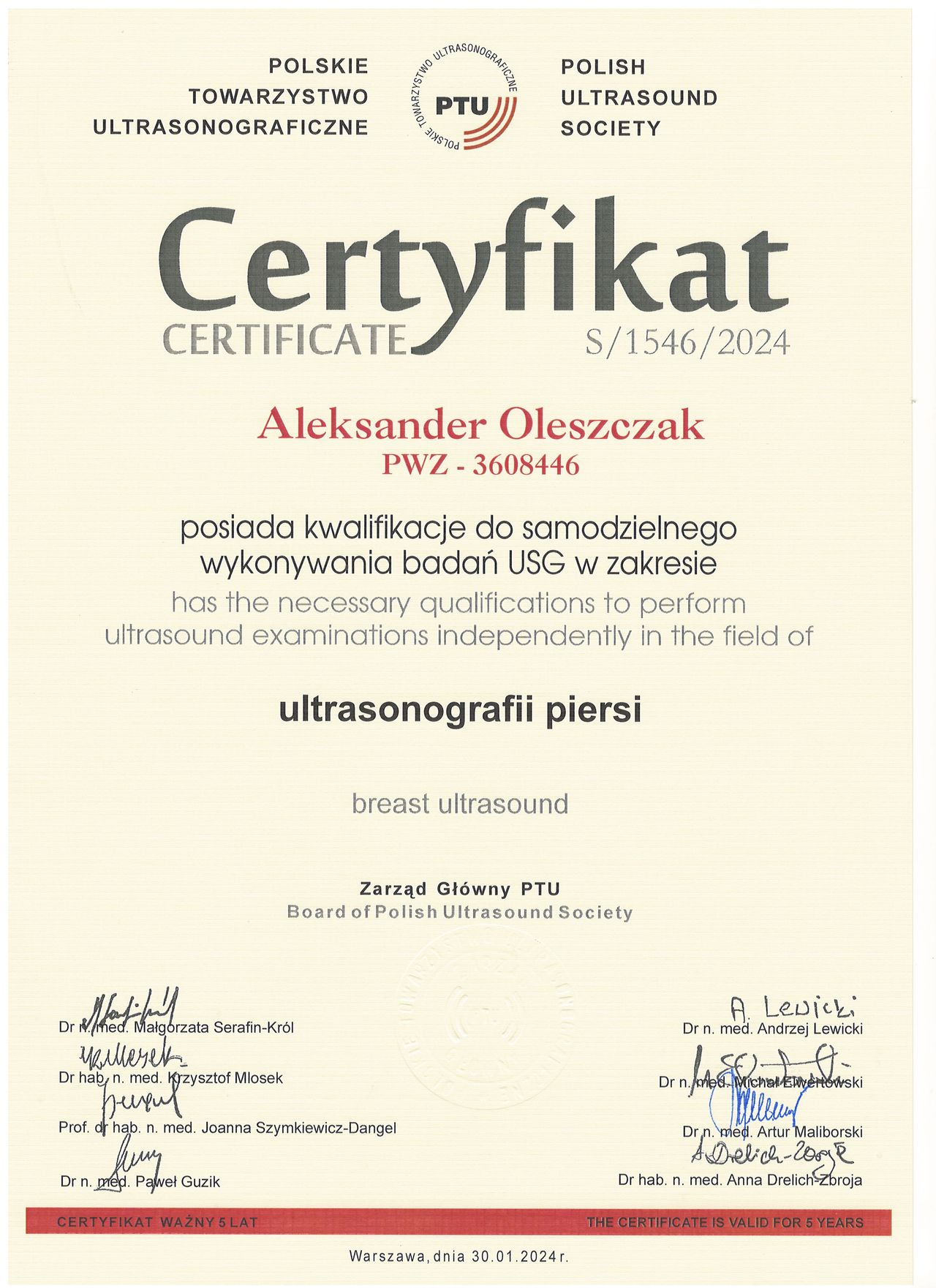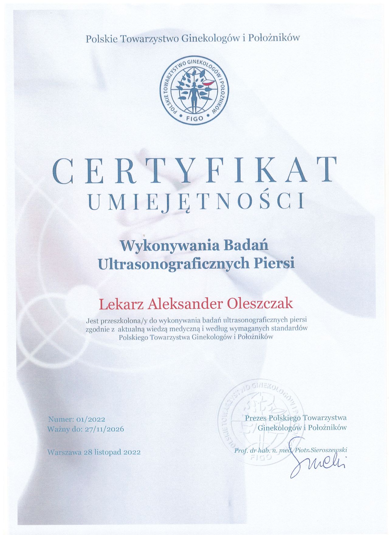 Pan Doktor Aleksander Oleszczak zdiagnozował rakową zmianę na twarzy mojego ojca i szybko ją usunął (wycięcie). Jest nie tylko świetnym lekarzem w diagnostyce onkologicznej, ale także bardzo sprawnym, wysoce fachowym chirurgiem. Przy tym jest ciepłym, życzliwym i wrażliwym człowiekiem. Jako rodzina jesteśmy głęboko wdzięczni Panu Doktorowi za szybką, profesjonalną pomoc udzieloną naszemu ojcu i dziadkowi. Oby było więcej takich lekarzy!