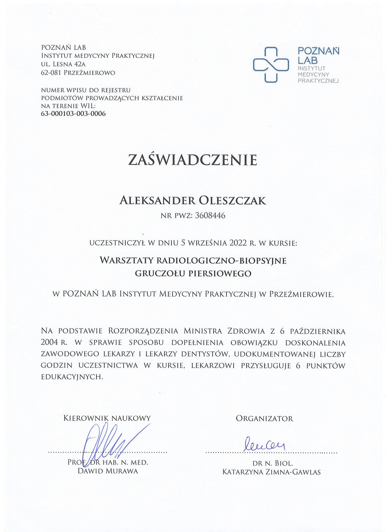 Jak Aleksander Oleszczak umawia wizyty?Aleksander Oleszczak używa kalendarza ZnanyLekarz, dlatego na stronie widzisz aktualne terminy. Wystarczy, że wybierzesz datę i godzinę, które odpowiadają Ci najbardziej. Umawianie wizyty jest darmowe, a tuż przed terminem wyślemy Ci przypomnienie.