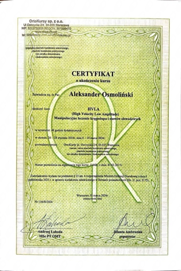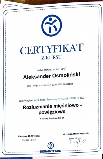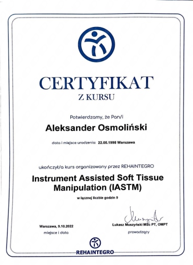My name is Aleksander Osmoliński, and I specialize in orthopedic, post-injury, post-surgical and overload physiotherapy, with a strong background in sports rehabilitation. I am currently pursuing postgraduate studies in Orthopaedic Manual Therapy (OMT) at the OMT Academy, allowing me to combine the latest scientific knowledge with precise, hands-on techniques.