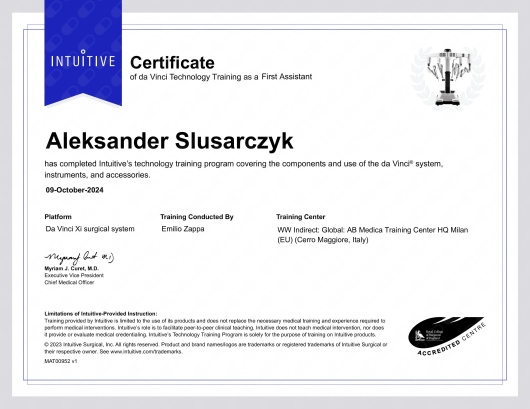 W 2024 roku ukończyłem kurs chirurgii robotycznej z użyciem systemu da Vinci Xi (Mediolan, Włochy). W czasie swojej kariery uczestniczyłem w licznych konferencjach naukowych, w tym bardzo często w roli wykładowcy.
