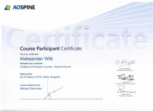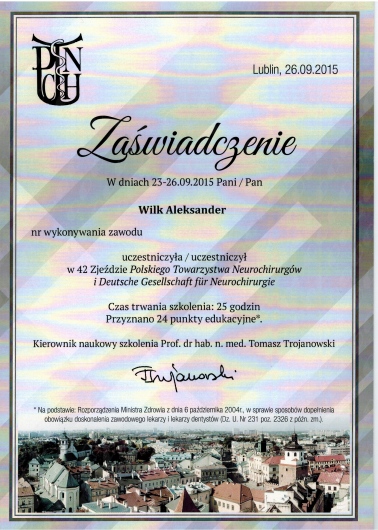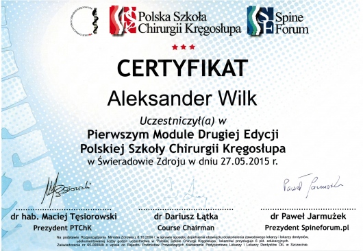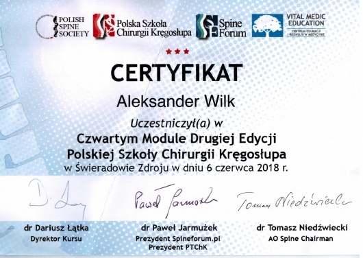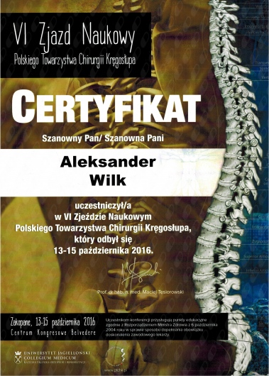 Serdecznie dziękuję Panu doktorowi Aleksandrowi Wilk za pomoc w odzyskaniu zdrowia po operacji kręgosłupa lędźwiowego (stenoza L4/L5). Operacja była ciężka, a Pan doktor przeprowadził ją z pełnym profesjonalizmem i fachem. Polecam każdemu Pana Doktora.• Szpital Uniwersytecki w Krakowie • Inny •