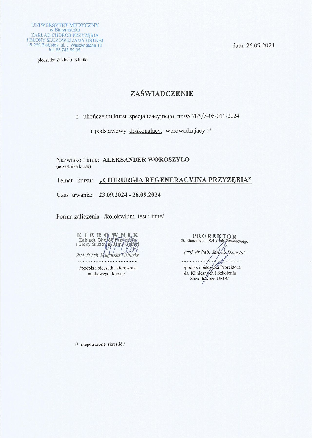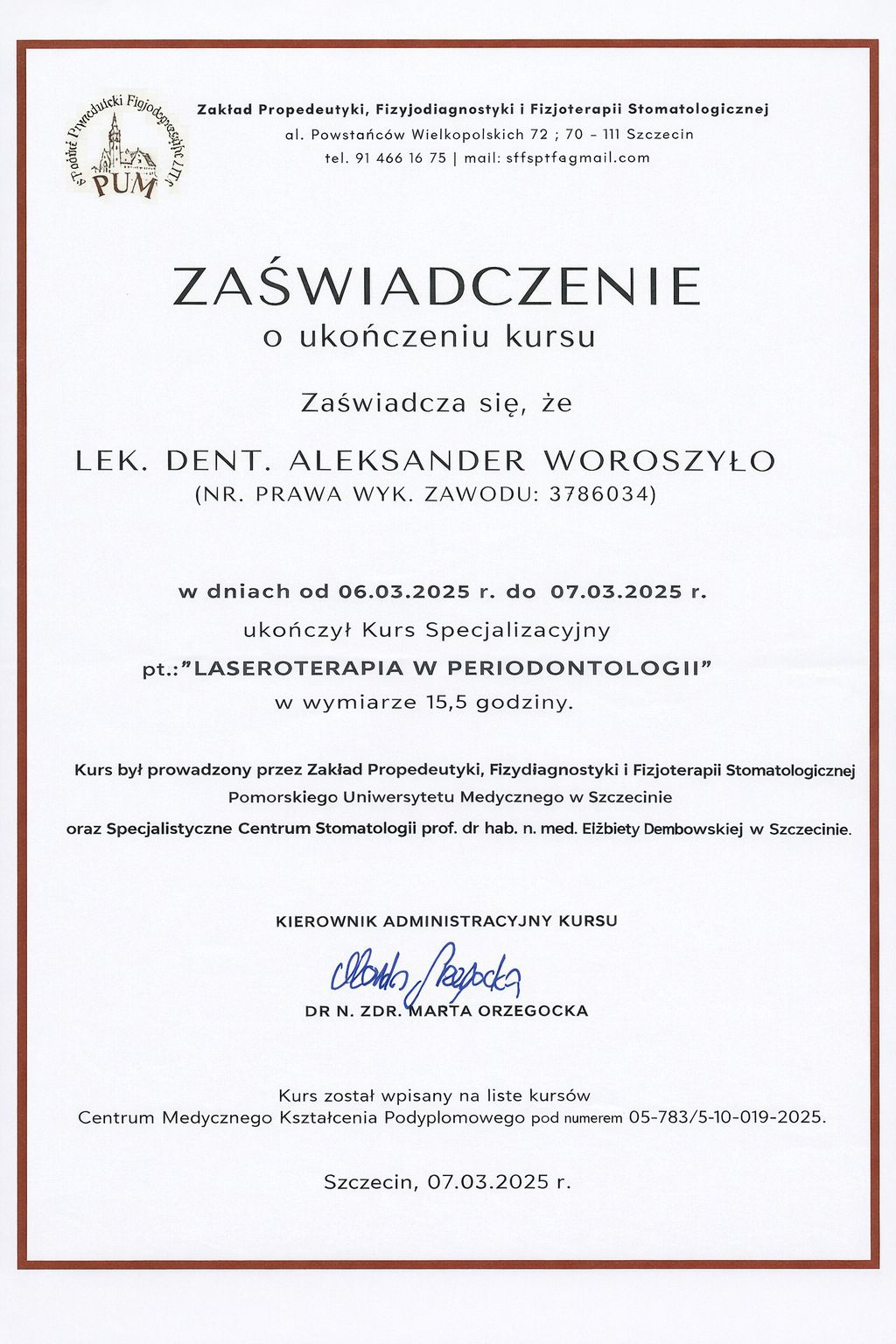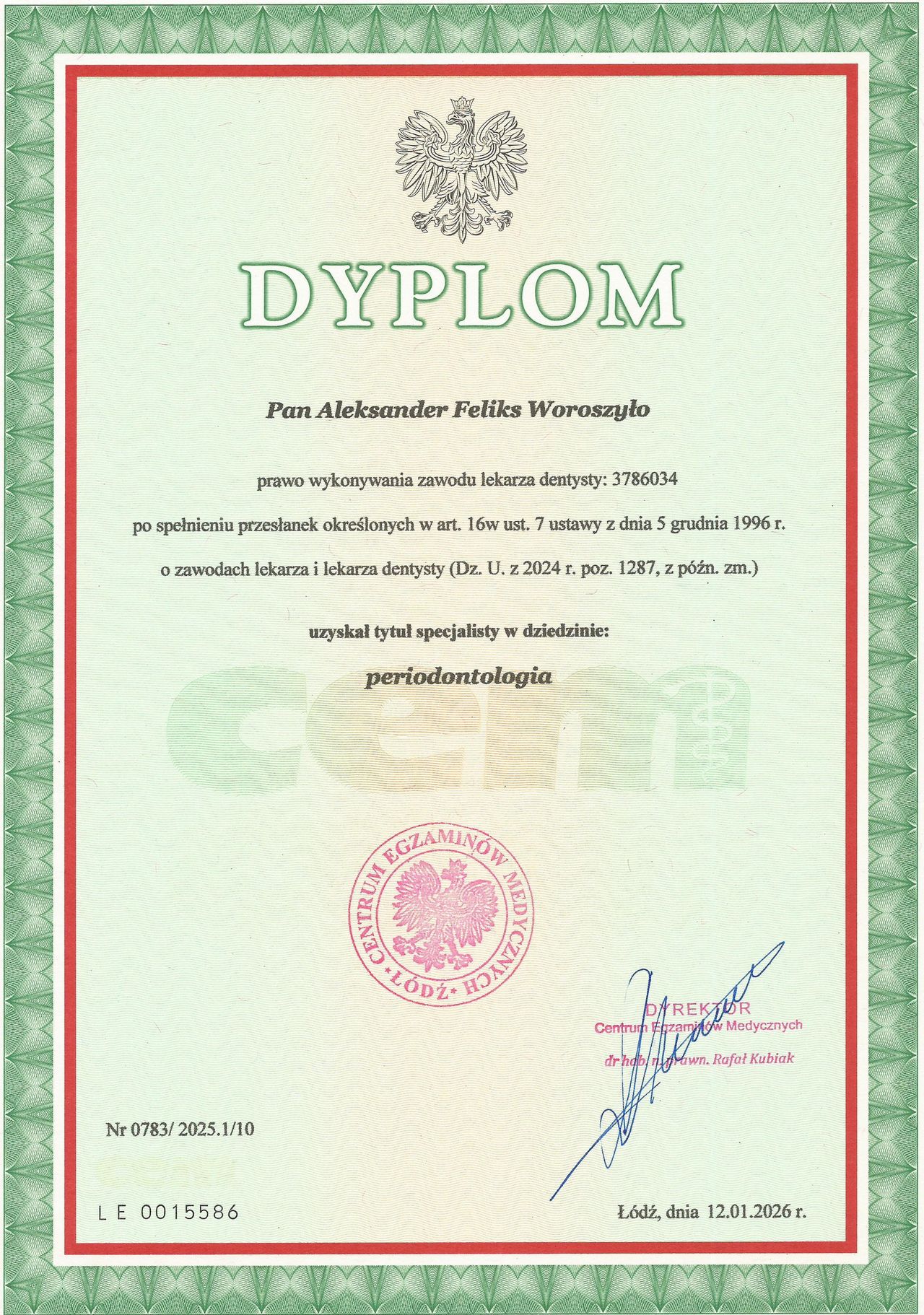 Jaki jest zakres porad oferowanych przez Aleksander Woroszyło?Aleksander Woroszyło to stomatolog, periodontolog. Na podstawie swojego doświadczenia i wykształcenia Aleksander Woroszyło oferuje usługi takie jak: Konsultacja chirurgiczna, Konsultacja periodontologiczna, operacyjne usunięcie zęba całkowicie zatrzymanego, usunięcie zęba, SRP (kiretaż), plastyka dziąseł, wypełnienie kompozytowe.
