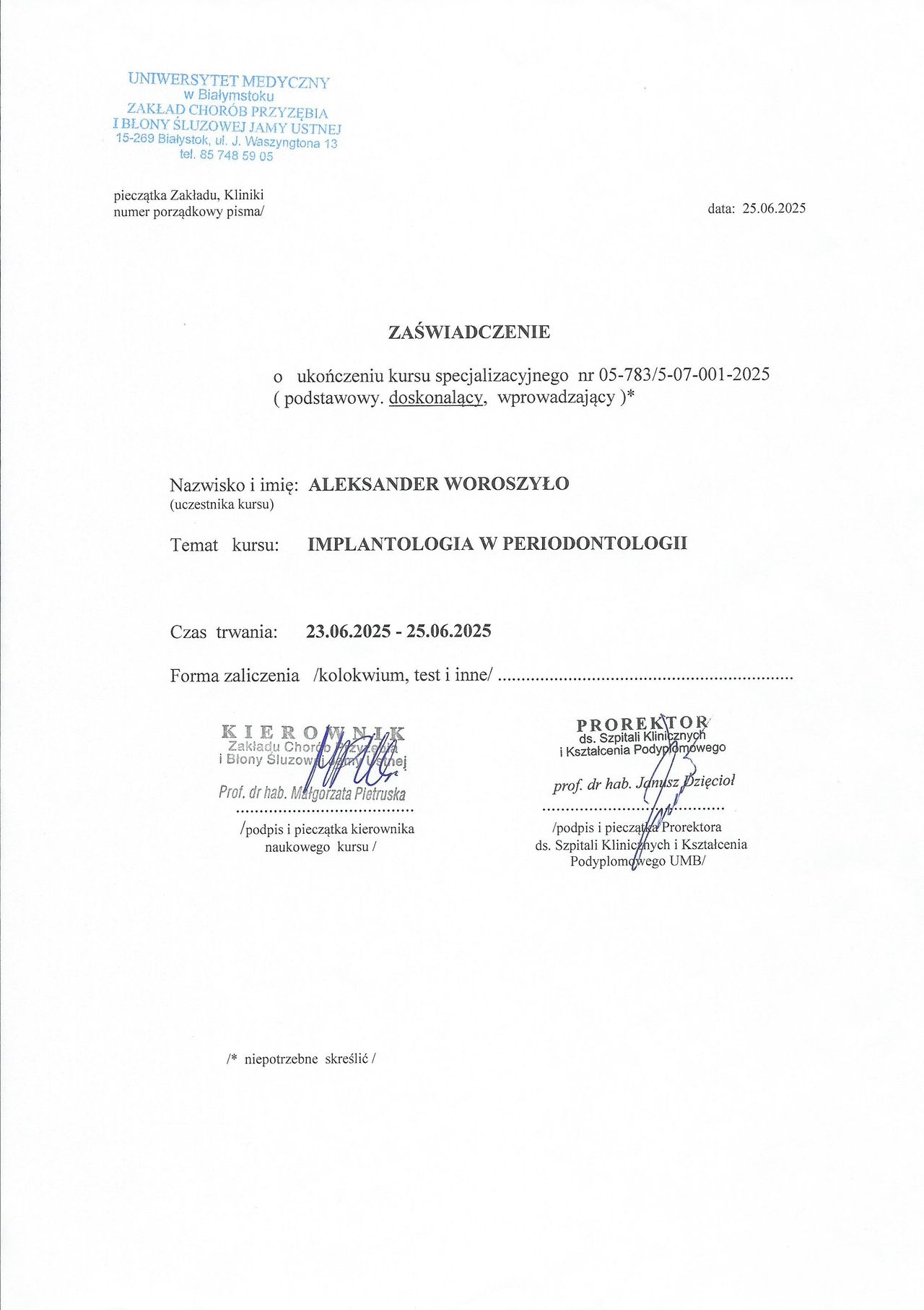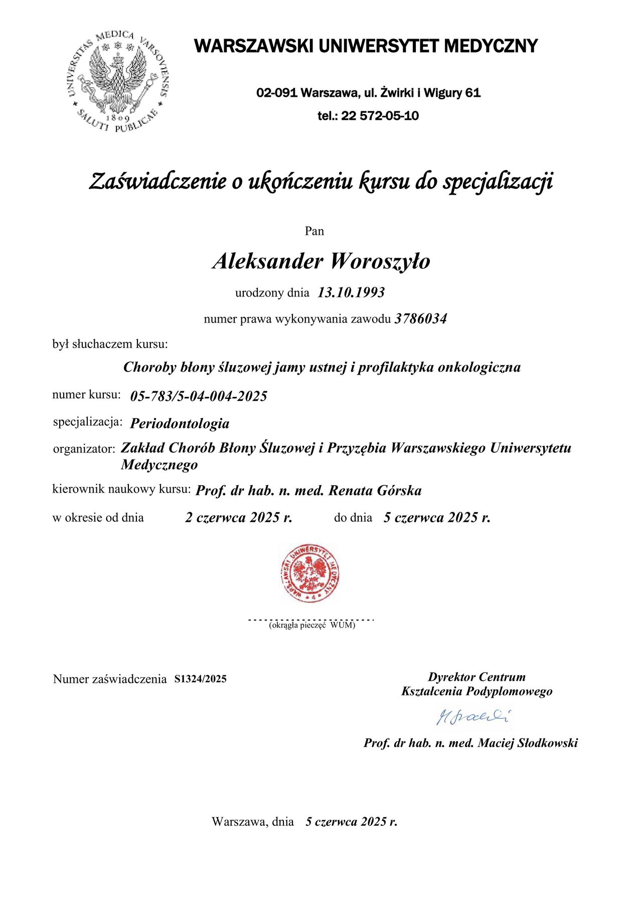 Jestem absolwentem Warszawskiego Uniwersytetu Medycznego. Tytuł lekarza specjalisty w dziedzinie periodontologii uzyskałem w Poradni Chirurgii i Periodontologii Mazowieckiego Centrum Stomatologii. Obecnie jestem pracownikiem klinicznym Poradni Stomatologii Estetycznej Uniwersyteckiego Centrum Stomatologii WUM. W codziennej praktyce zajmuję się kompleksowym leczeniem chorób przyzębia – zarówno niechirurgicznym, jak i chirurgicznym – oraz chirurgią stomatologiczną. Pomagam pacjentom w leczeniu krwawienia dziąseł, paradontozy oraz utraty kości, dążąc do zachowania własnych zębów jak najdłużej. Każdy plan leczenia dostosowuję indywidualnie do potrzeb pacjenta.