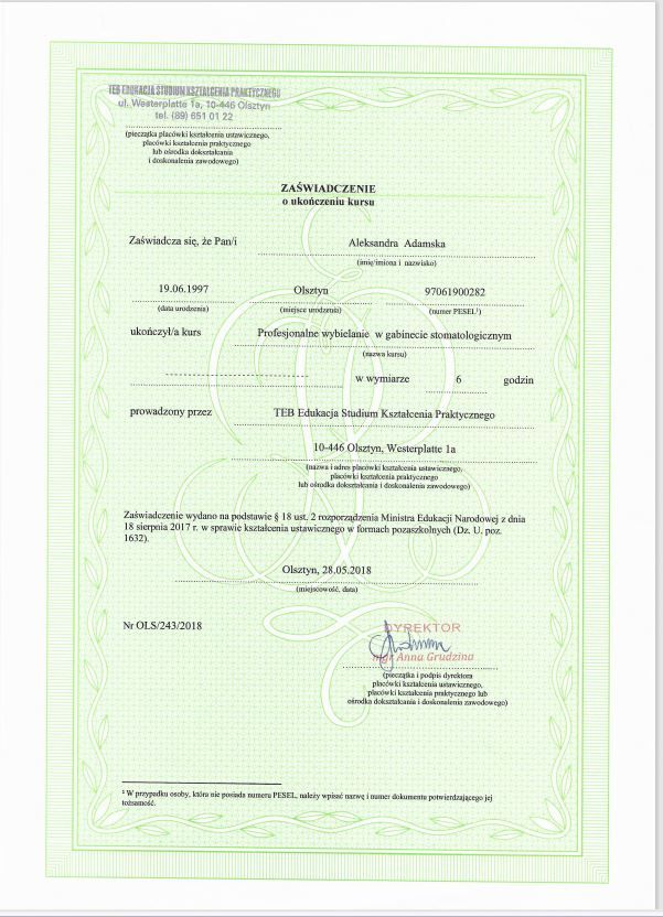 Nieustannie rozwijam swoje umiejętności, uczestnicząc w szkoleniach i kursach, aby zapewniać opiekę na jak najwyższym poziomie.