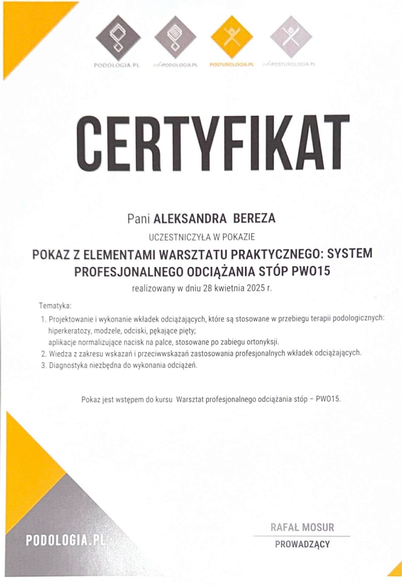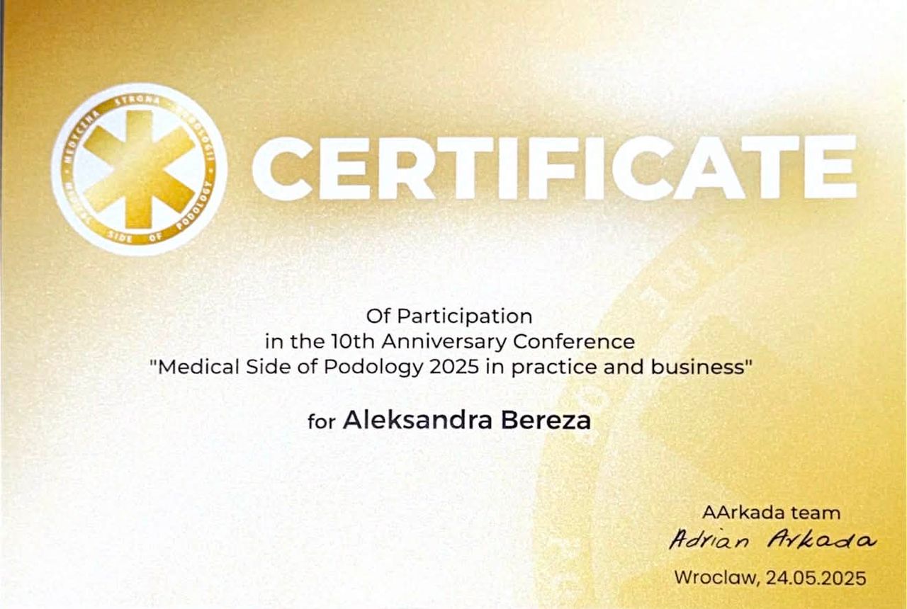 Jestem studentką ostatniego semestru podologii i traktuję tę dziedzinę nie tylko jako kierunek nauki, ale przede wszystkim jako pasję. Regularnie uczestniczę w szkoleniach, kursach oraz konferencjach, aby stale podnosić swoje kwalifikacje i zapewniać pacjentom profesjonalną, bezpieczną i skuteczną opiekę.