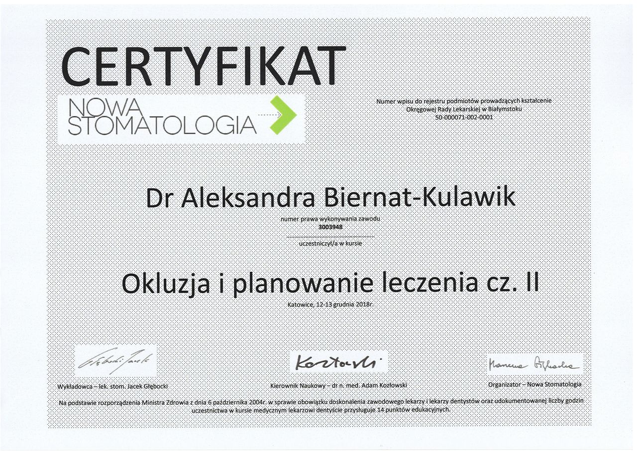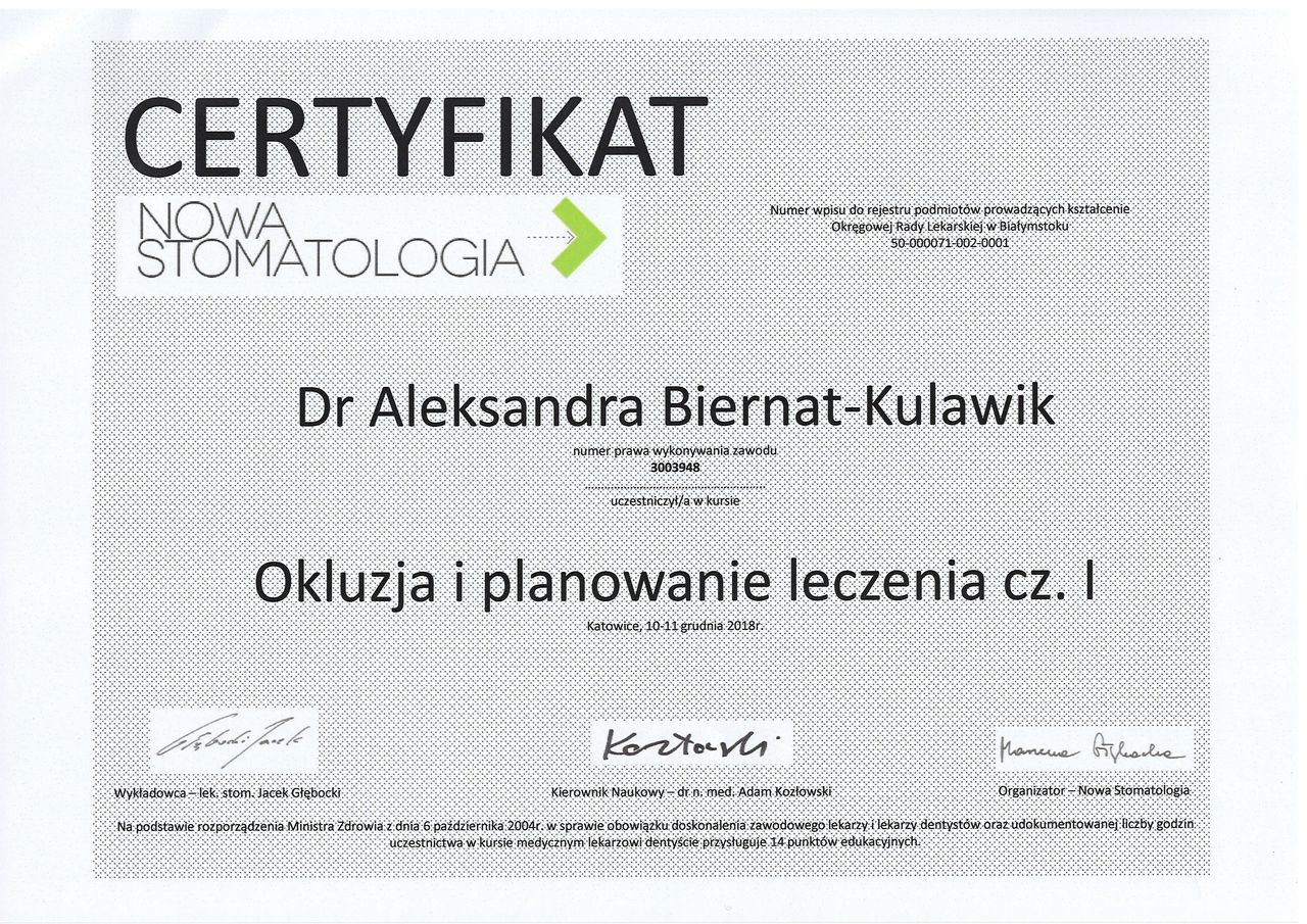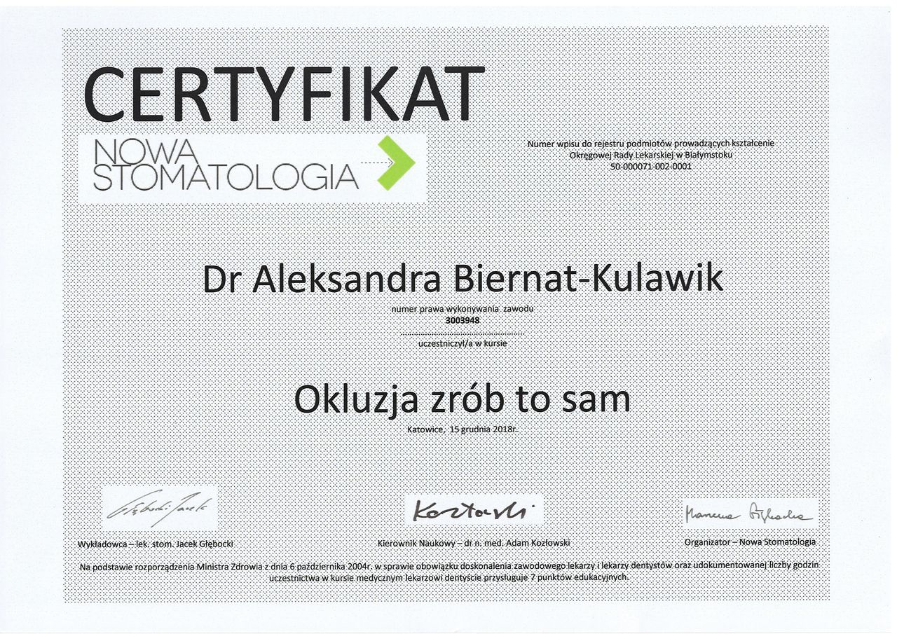 Jaki jest zakres porad oferowanych przez Aleksandra Biernat-Kulawik?Aleksandra Biernat-Kulawik to stomatolog. Na podstawie swojego doświadczenia i wykształcenia Aleksandra Biernat-Kulawik oferuje usługi takie jak: Konsultacja stomatologiczna, diagnostyka RTG/CBCT, Leczenie endodontyczne.