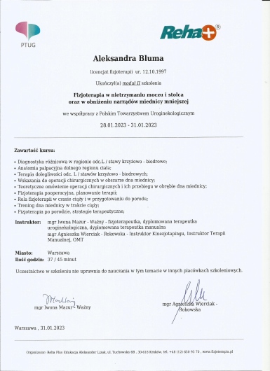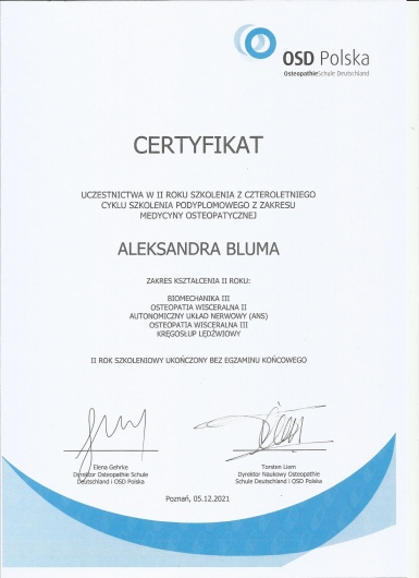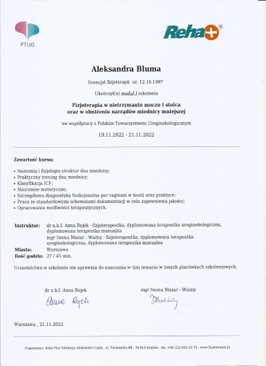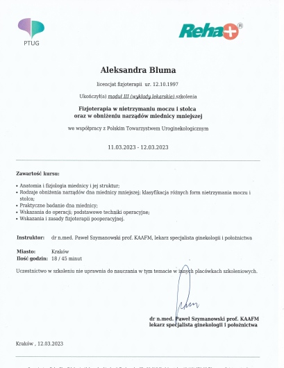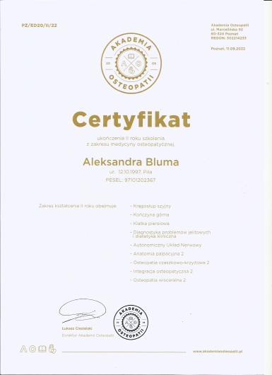 Jestem absolwentką Uniwersytetu Medycznego w Poznaniu, dyplomowanym osteopatą (studia ukończyłam w Akademii Osteopatii) oraz certyfikowaną fizjoterapeutką uroginekologiczną Polskiego Towarzystwa Uroginekologicznego. Specjalizuję się w terapii uroginekologicznej, proktologicznej oraz stomatologicznej – dziedzinach, które wymagają szczególnej wiedzy, wrażliwości i szacunku dla złożoności ludzkiego ciała. W mojej pracy nie skupiam się jedynie na objawach, lecz szukam przyczyn zgłaszanych dolegliwości. Stawiam na indywidualne podejście do pacjenta, kładąc nacisk na profilaktykę i zwiększenie samoświadomości swoich pacjentów. W terapii łączę pracę manualną z aktywną pracą z pacjentem, ucząc indywidualnie dobranych ćwiczeń w ramach autoterapii.