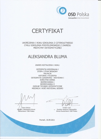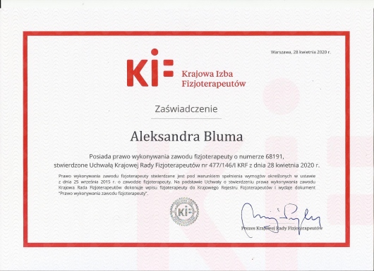 Jaki jest zakres porad oferowanych przez Aleksandra Bluma-Mruczyńska?Aleksandra Bluma-Mruczyńska to fizjoterapeuta, osteopata. Na podstawie swojego doświadczenia i wykształcenia Aleksandra Bluma-Mruczyńska oferuje usługi takie jak: konsultacja fizjoterapeutyczna, fizjoterapia szczękowo- twarzowa, rehabilitacja stomatologiczna, rehabilitacja ortopedyczna, terapia mięśniowo-powięziowa, Terapia tkanek miękkich, terapia przeciwbólowa, terapia kobiet w ciąży, terapia stawów skroniowo-żuchwowych, terapia wisceralna.