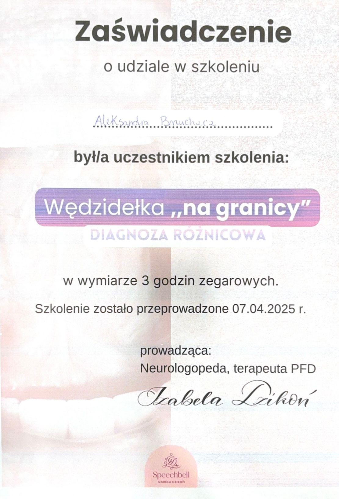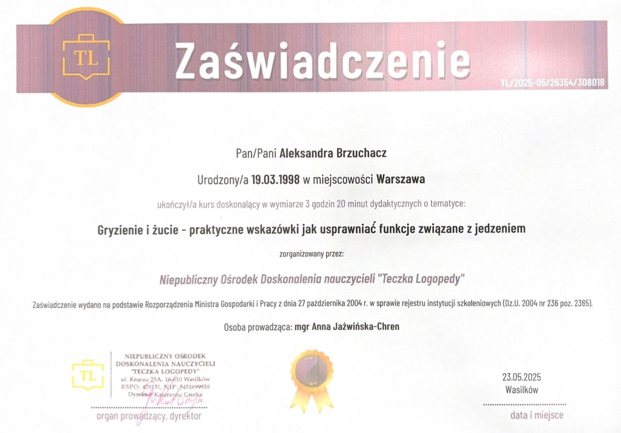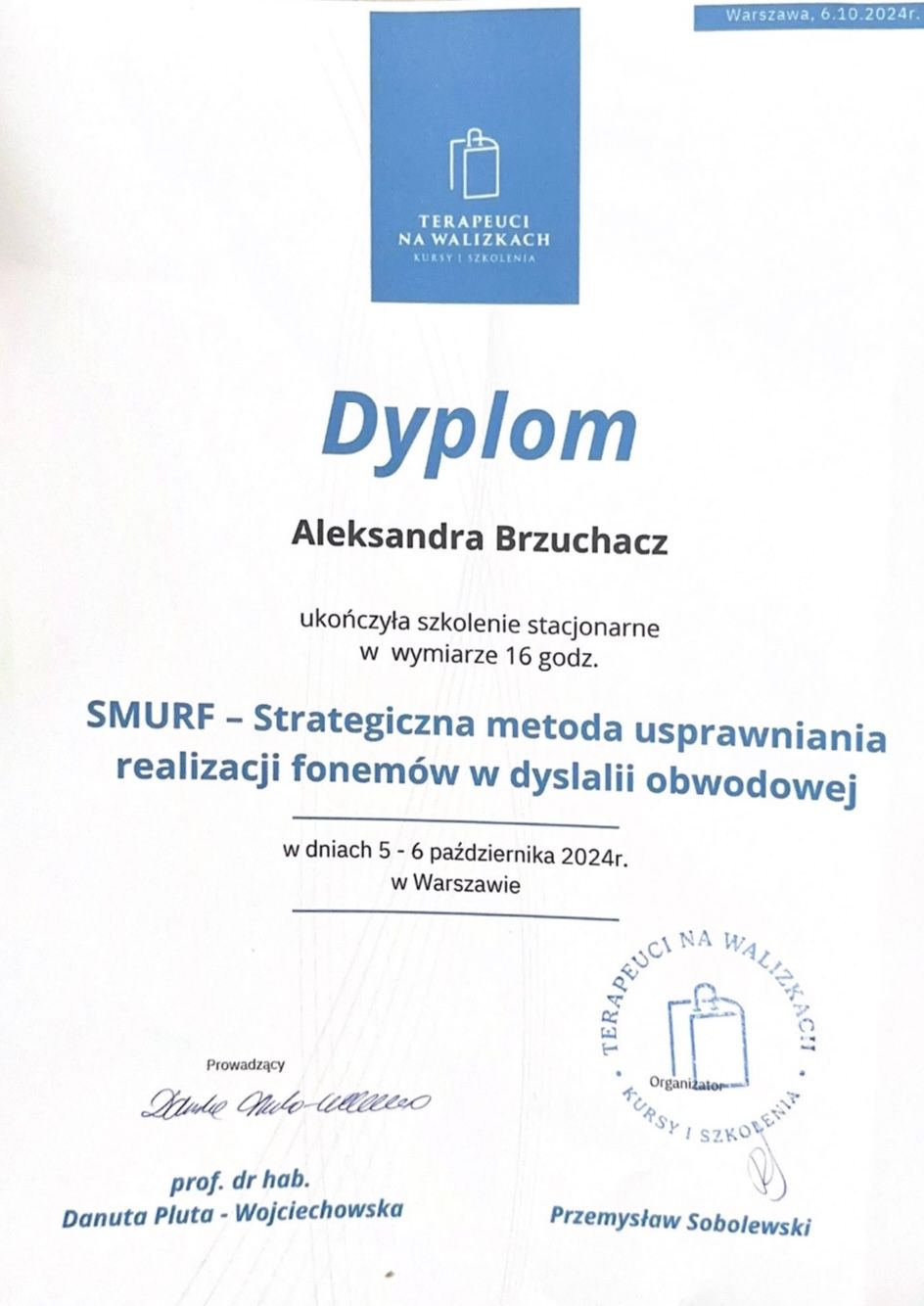 Pani Aleksandra prowadzi zajęcia z moją 6-letnią córką w przedszkolu i z pełnym przekonaniem mogę polecić jej pracę. Już po kilku miesiącach regularnych spotkań zauważyliśmy znaczną poprawę w wymowie, zwłaszcza trudniejszych głosek, takich jak „sz” i „cz”. Pani Aleksandra ma świetne podejście do dzieci – zajęcia są prowadzone w miłej atmosferze, z dużym zaangażowaniem i profesjonalizmem. Bardzo dziękujemy!