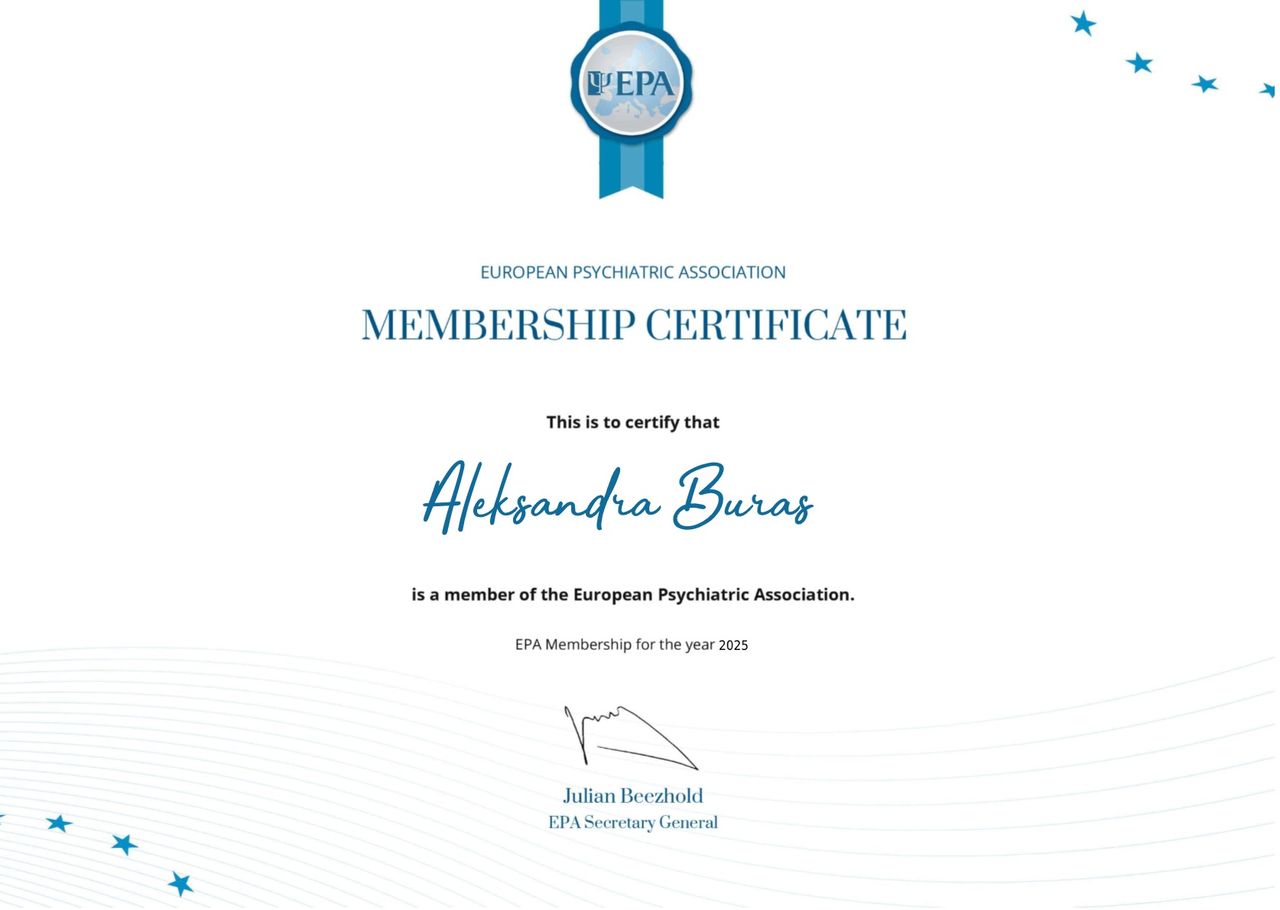 2025 – Europejski Egzamin Specjalizacyjny z Psychiatrii (European Board Examination in Psychiatry). Uzyskanie pozytywnego wyniku egzaminu stanowi potwierdzenie spełniania europejskich standardów wiedzy i kompetencji w zakresie psychiatrii (w 2025 roku jedynie 19 lekarzy z Polski otrzymało pozytywny wynik testu).