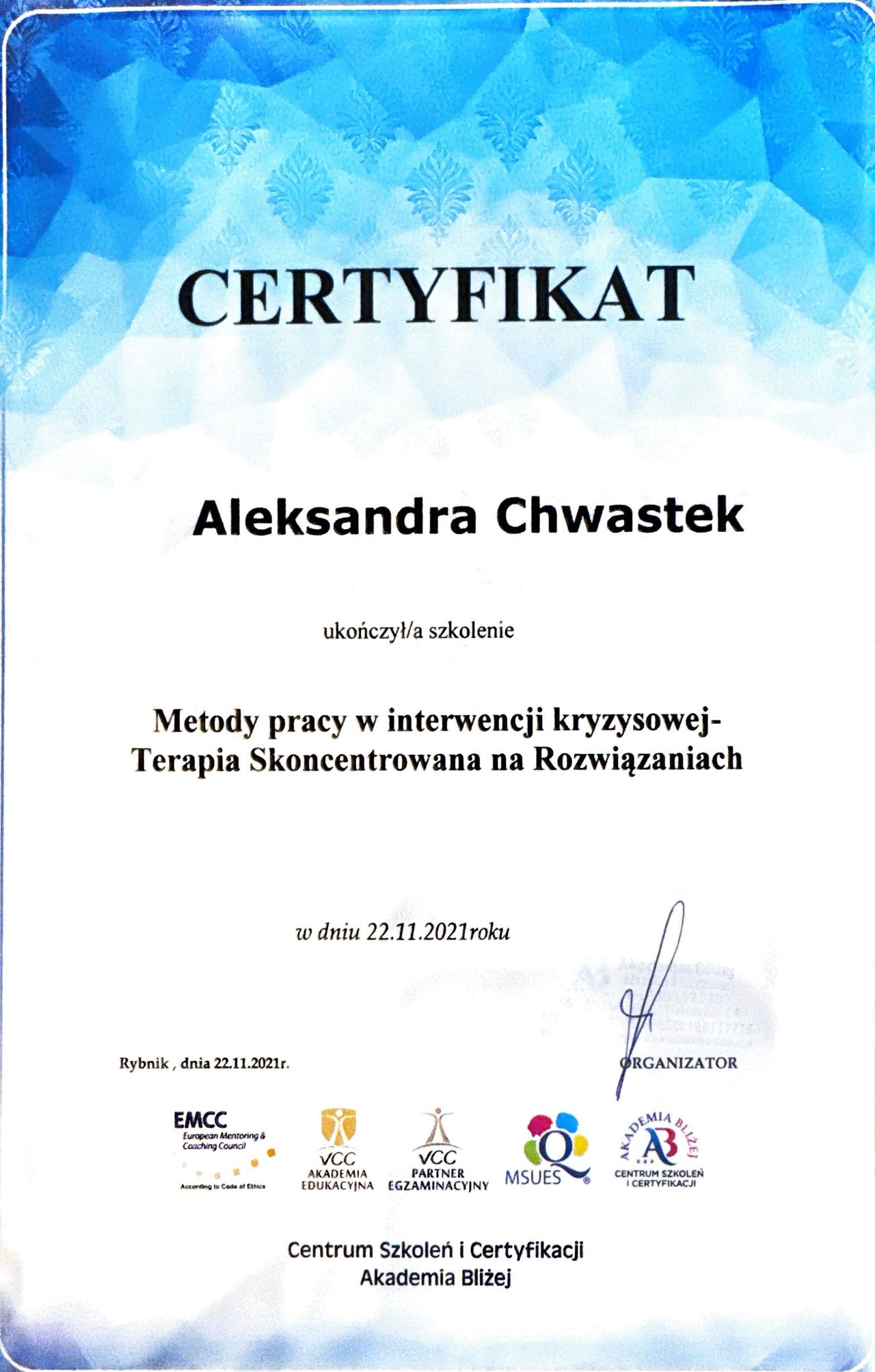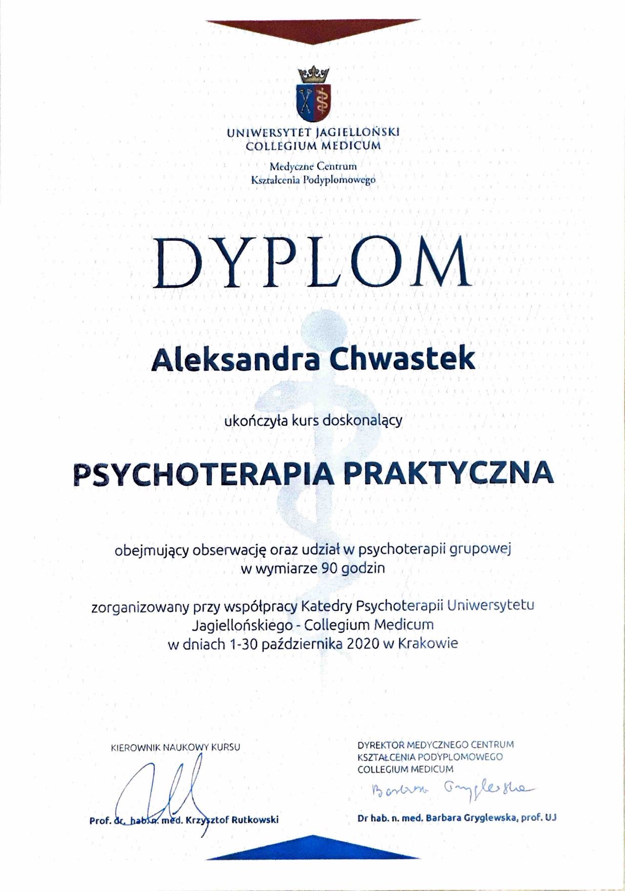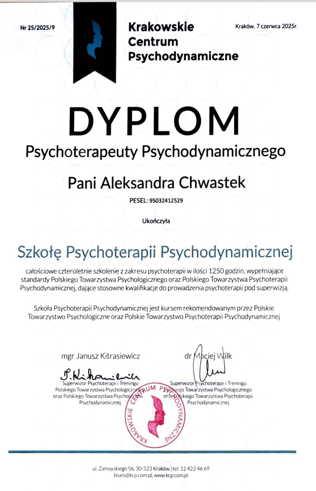 Zawód psychoterapeuty zdobyłam, kończąc czteroletni Kurs Psychoterapii organizowany przez Krakowskie Centrum Psychodynamiczne, rekomendowane przez Polskie Towarzystwo Psychologiczne.