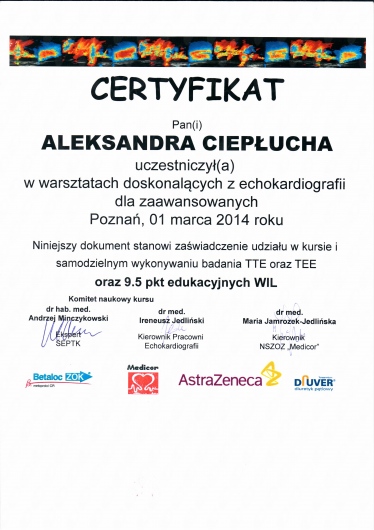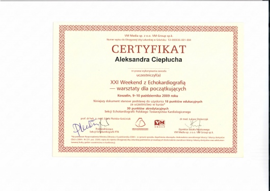 Jaki jest zakres porad oferowanych przez Aleksandra Ciepłucha?Aleksandra Ciepłucha to kardiolog. Na podstawie swojego doświadczenia i wykształcenia Aleksandra Ciepłucha oferuje usługi takie jak: konsultacja kardiologiczna, ECHO serca, konsultacja kardiologiczna + EKG + ECHO serca, konsultacja kardiologiczna + ECHO serca, konsultacja kardiologiczna + EKG, EKG - elektrokardiografia.