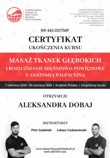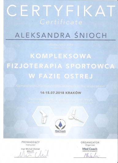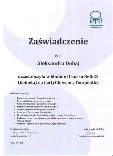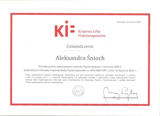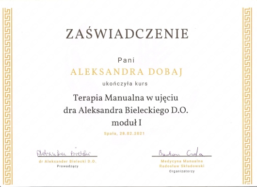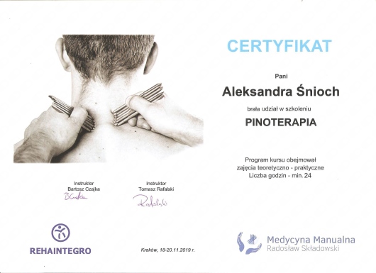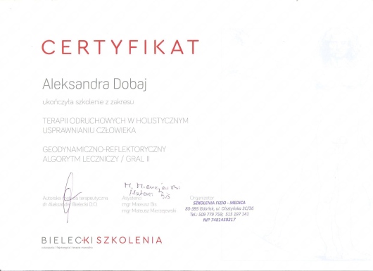 Moje kwalifikacje są potwierdzone licznymi certyfikatami, w tym z zakresu terapii manualnej (GRAL), pinoterapii oraz specjalistycznych szkoleń dotyczących treningu kobiet w ciąży i po porodzie. Nieustannie poszerzam swoją wiedzę, aby zapewnić pacjentom najwyższą jakość opieki terapeutycznej.