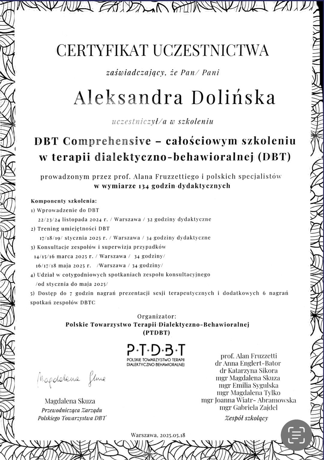 Ukończyłam całościowe szkolenie DBT Comprehensive oraz jestem członkiem Towarzystwa Terapii Poznawczo-Behawioralnej.