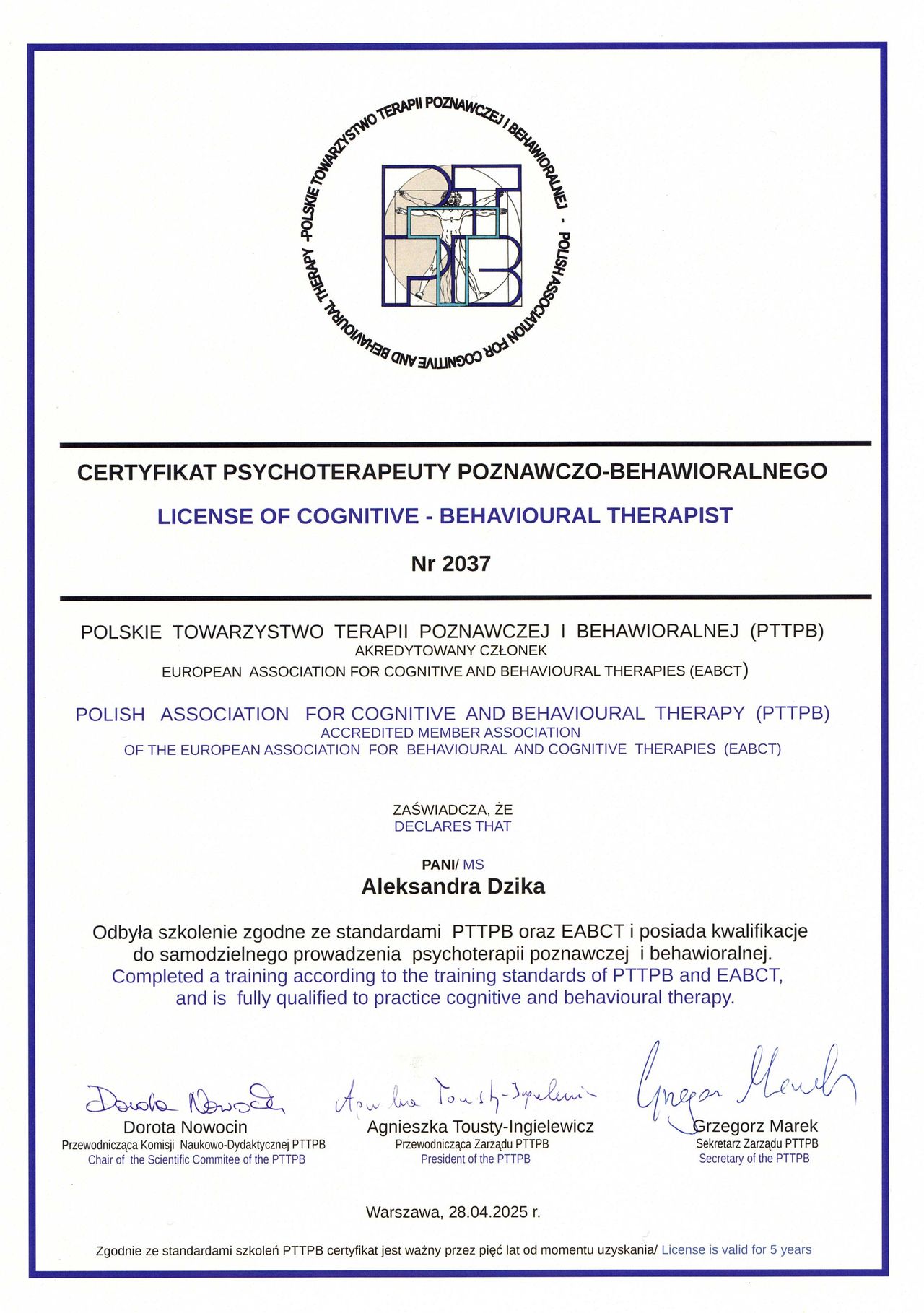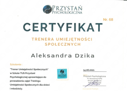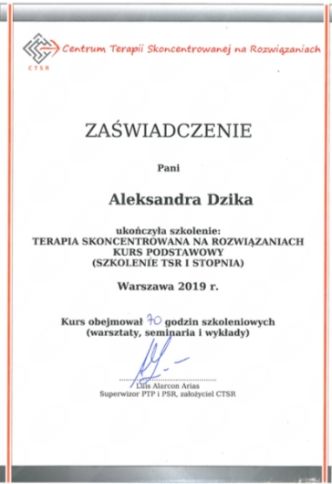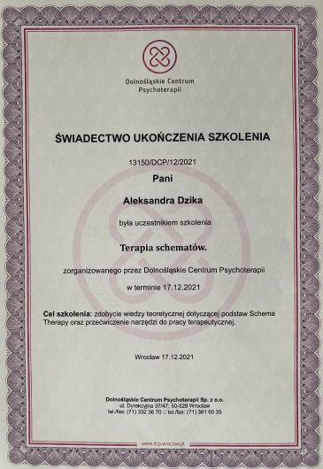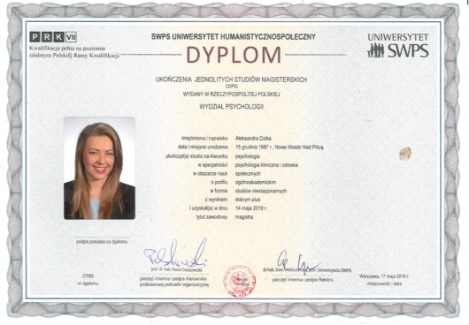 Zdecydowanie polecam panią Aleksandrę! Przeprowadziła mnie skutecznie przez proces terapii potrzebny do poradzenia sobie z problemem, z którym zmagałam się ponad 20 lat. Zwiększyła moją wiedzę psychologiczną i uzbroiła w narzędzia, które ułatwiają radzenie sobie na codzień.