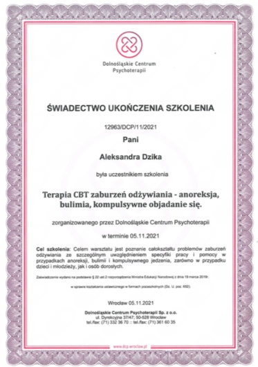 Jaki jest zakres porad oferowanych przez Aleksandra Dzika?Aleksandra Dzika to psychoterapeuta certyfikowany, psycholog. Na podstawie swojego doświadczenia i wykształcenia Aleksandra Dzika oferuje usługi takie jak: psychoterapia indywidualna (kolejna wizyta), psychoterapia indywidualna dorosłych online, Psychoterapia indywidualna młodzieży, konsultacja psychoterapeutyczna, Konsultacja psychologiczna, psychoterapia w języku angielskim, psychoterapia par, psychoterapia par online, konsultacja online.