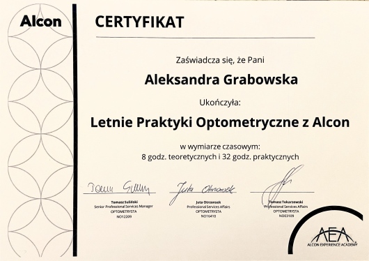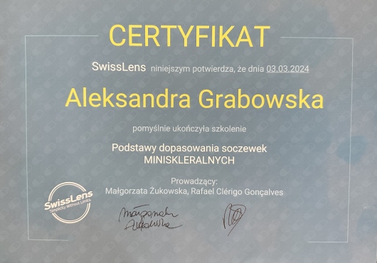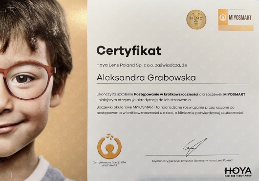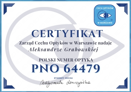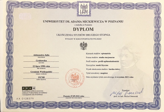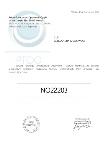 Jestem absolwentką Optometrii na Wydziale Fizyki Uniwersytetu im. Adama Mickiewicza w Poznaniu. Zajmuję się doborem korekcji okularowej, soczewek progresywnych oraz miękkich soczewek kontaktowych u osób dorosłych i dzieci od lat 8. Posiadam wpis do Rejestru Zawodów Medycznych RIZM 1500088030, Numer Optometrysty NO22203, Polski Numer Optyka PNO64479 oraz w miarę możliwości staram się uczestniczyć w branżowych konferencjach oraz webinariach. Na rzecz pracy magisterskiej stworzyłam korekcję okularową stabilizującą układ wzrokowy podczas pracy z urządzeniami mobilnymi a wyniki badań prezentowałam na 14. Ogólnopolskim Kongresie Optyków KRIO. Odbyłam zagraniczne praktyki z zakresu soczewek kontaktowych na Uniwersytecie Bicocca w Mediolanie. Stale poszerzam wiedzę i zdobywam doświadczenie przy współpracy z lekarzami okulistami oraz specjalistami z zakresu optometrii.