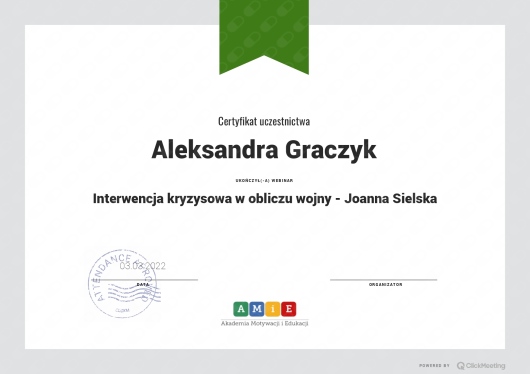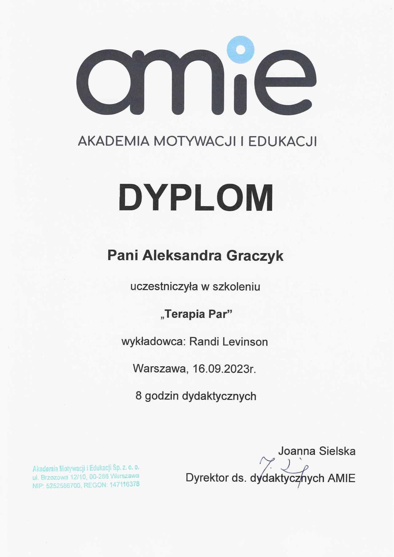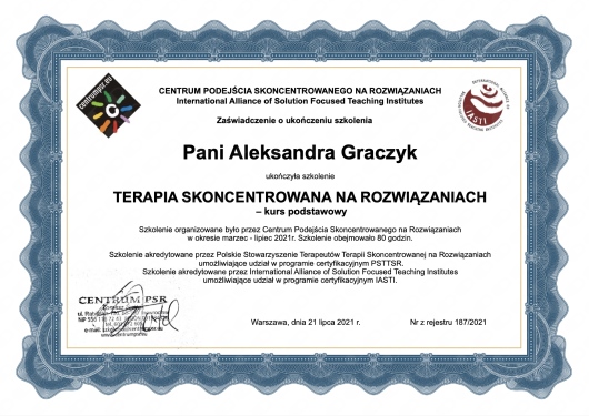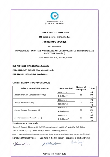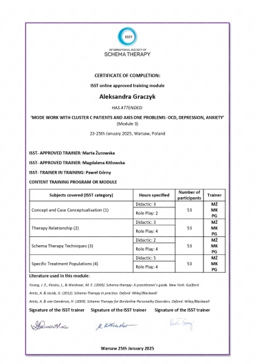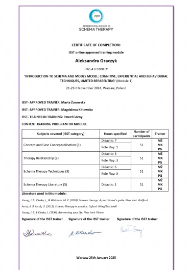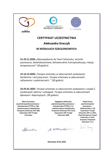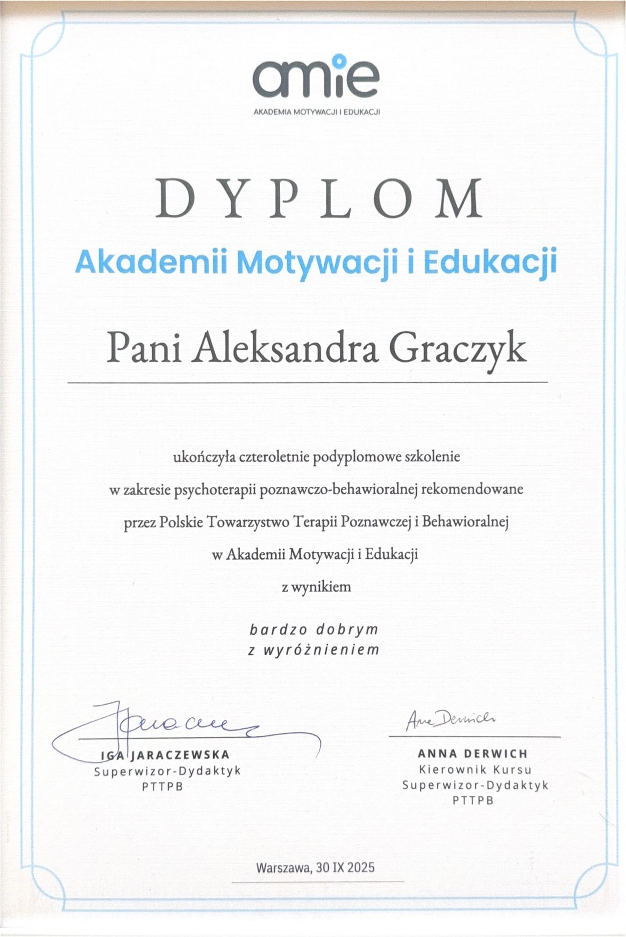 Ukończyłam czteroletnie, akredytowane szkolenie z zakresu psychoterapii Poznawczo-Behawioralnej (CBT) obejmujące Dialog Motywujący i Terapię Trzeciej Fali w Akademii Motywacji i Edukacji.