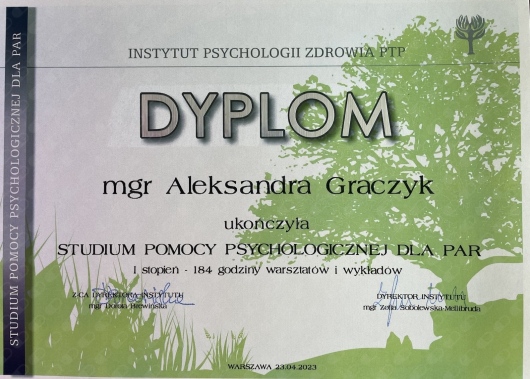 Współpracuję z Parami w kryzysie. Ukończyłam studium pomocy psychologicznej dla par w Instytucie Psychologii Zdrowia PTP.