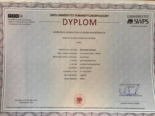 Studiowałam psychologię społeczną na Uniwersytecie SWPS, gdzie specjalizowałam się w psychologii biznesu, kryzysu i zmiany. Równolegle ukończyłam profilaktykę i pedagogikę społeczną na Uniwersytecie Warszawskim. Interdyscyplinarne wykształcenie wykorzystuję na co dzień w pracy, dzięki niemu szerzej rozumiem złożoność ludzkiego życia.