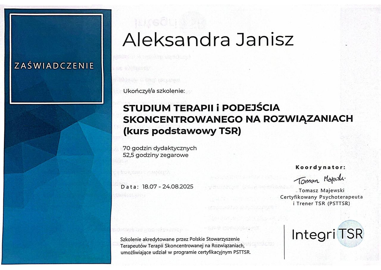 Już od pierwszej wizyty poczułam, że jestem w dobrych rękach. Pani Aleksandra jest bardzo empatyczna, cierpliwa i wzbudza zaufanie. Bardzo cenię sobie jej profesjonalizm i całościowe podejście do mojego problemu