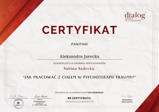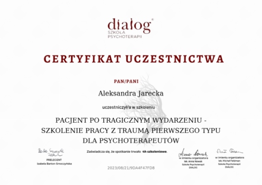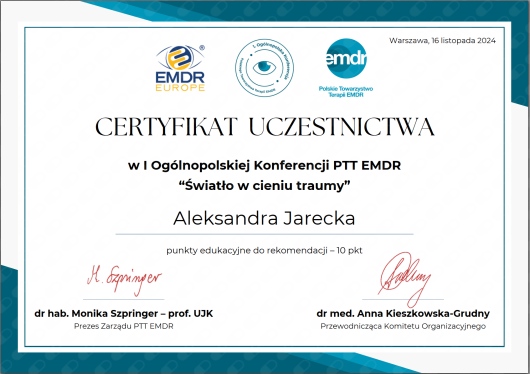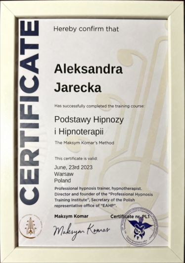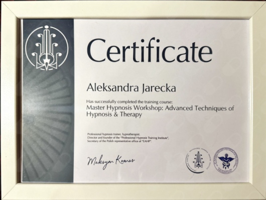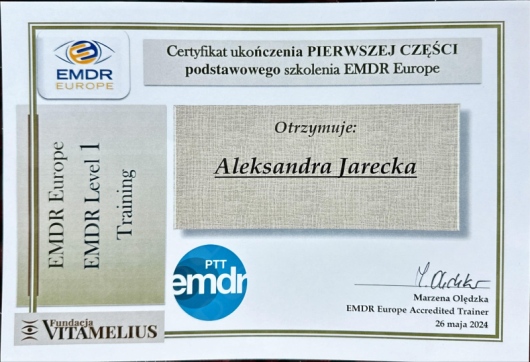 Ukończyłam jednolite studia magisterskie z psychologii na Katolickim Uniwersytecie Lubelskim Jana Pawła II, uzyskując tytuł magistra psychologii. Posiadam dyplom terapeuty EMDR (Eye Movement Desensitization and Reprocessing) i należę do Polskiego Towarzystwa Terapii EMDR, akredytowanego przez EMDR Europe. Jestem również certyfikowanym hipnoterapeutą pierwszego i drugiego stopnia, akredytowanym przez Professional Hypnosis Training Institute, oraz członkiem Polskiego Towarzystwa Psychiatrycznego.