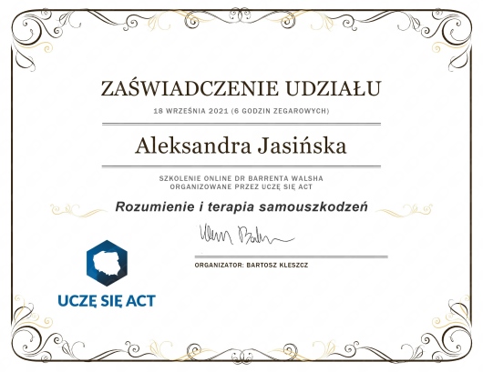 Dodatkowe szkolenia: Cały czas staram się uczyć i rozwijać, uczestnicząc w kongresach, kursach i szkoleniach dla psychoterapeutów (Terapia Schematu, DBT, Dialog motywujący, ACT – Terapia Akceptacji i Zaangażowania, Mindfulness, etc.): - I Ogólnopolska Interdyscyplinarna Konferencja pt.: „Psychoterapia, Psychologia Kliniczna i Psychiatria” – Międzynarodowa Konferencja Naukowa „Terapia poznawczo-behawioralna 2007-2022. Integracja.” – Rozumienie i terapia samouszkodzeń – Barent Walsh, – Reskrypcja wyobrażeniowa u pacjentów z zaburzeniami osobowości – Arnoud Arntz (warsztat w ramach kongresu EABCT - Belfast), - MBSR (Mindfulness-Based Stress Reduction / Redukcja Stresu Oparta na Uważności) – Anna Gubernat, - Techniki wyobrażeniowe w terapii schematów – Olga Olszewska, - Praca z Trybami Schematów oraz Praca z Nieadaptacyjnymi Schematami – techniki doświadczeniowe, - Zaburzenia osobowości borderline – diagnoza i terapia – DCP, - Psychoterapia poznawczo-behawioralna zaburzeń lękowych i afektywnych – DCP, - Certyfikat szkolenia psychoterapeutycznego z modułem zaburzeń odżywiania się – Ewa Jawińska.
