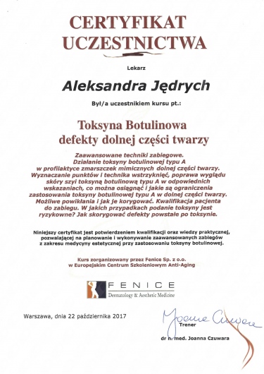 Jaki jest zakres porad oferowanych przez Aleksandra Jędrych?Aleksandra Jędrych to lekarz wykonujący zabiegi medycyny estetycznej, lekarz rodzinny. Na podstawie swojego doświadczenia i wykształcenia Aleksandra Jędrych oferuje usługi takie jak: Konsultacja z zakresu medycyny estetycznej, Botoks, Botoks - nadpotliwość, Toksyna botulinowa, Toksyna botulinowa nadpotliwość pachy, Toksyna botulinowa nadpotliwość dłonie, Kwas hialuronowy, Kwas hialuronowy - wolumertia, Kwas hialuronowy - usta, mezoterapia.