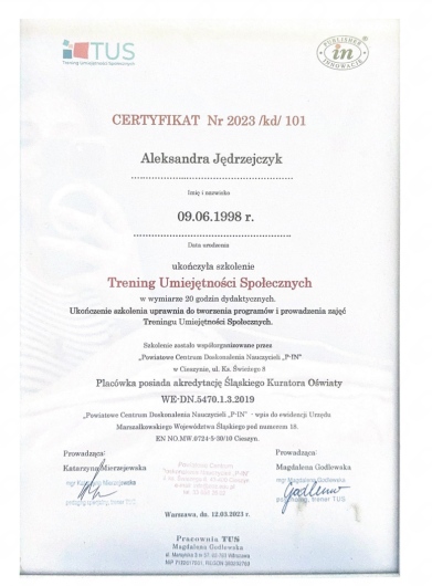 Jestem psychologiem, psychologiem dziecięcym oraz trenerem Treningu Umiejętności Społecznych. Ukończyłam jednolite studia magisterskie na Uniwersytecie im. Andrzeja Frycza Modrzewskiego w Krakowie na specjalności psychologia kliniczno-sądowa, a następnie uzupełniłam wykształcenie o przygotowanie pedagogiczne zdobyte w Wyższej Szkole Kształcenia Zawodowego we Wrocławiu. Doświadczenie zawodowe zdobywałam w poradniach prywatnych i psychologiczno-pedagogicznych, a także w przedszkolach, szkołach oraz w pracy indywidualnej z pacjentami w gabinecie i online. Pracuję z dziećmi, młodzieżą i dorosłymi, wspierając ich w rozwoju emocjonalnym, odnajdywaniu równowagi, budowaniu pewności siebie oraz lepszym rozumieniu własnych przeżyć.
