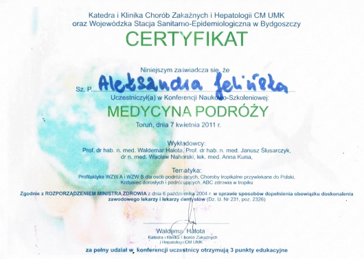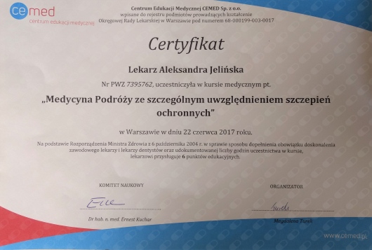 Od kilku lat przygotowuję również pacjentów do egzotycznych wojaży w ramach medycyny podróży. W ramach konsultacji kwalifikuję do szczepień oraz przygotowuję apteczkę podróżnika np ochronę przeciwmalaryczną.