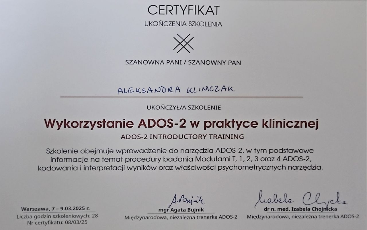 Jestem po diagnozie oraz po pierwszym spotkaniu odnośnie psychoedukacji ADHD. Pani Ola przyjęła mnie ciepło, wykazuje zrozumienie do mej osoby i mojego przypadku. Bardzo dobrze nam się pracuję, co sprawia, że jestem pełen optymizmu w stosunku do naszej dalszej współpracy.