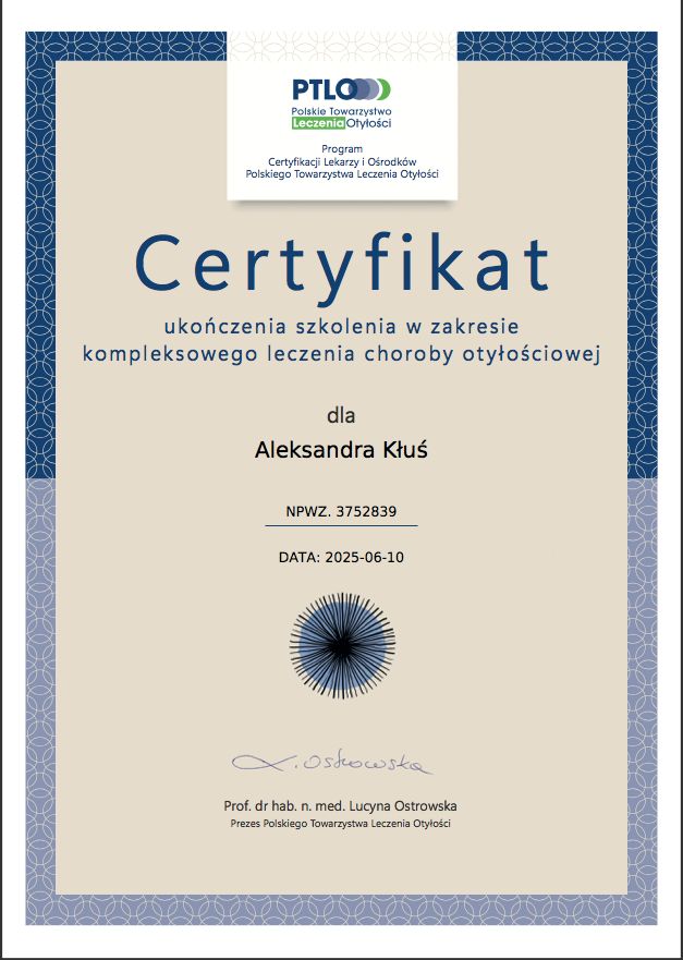 Zajmuję się profilaktyką oraz leczeniem powikłań otyłości, takich jak cukrzyca, nadciśnienie tętnicze i zaburzenia lipidowe. W 2025 roku uzyskałam certyfikację Polskiego Towarzystwa Leczenia Otyłości. Jestem członkinią Polskiego Towarzystwa Medycyny Stylu Życia oraz Polskiego Towarzystwa Lipidologicznego.