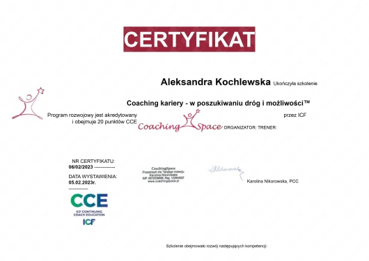 Polecam z całego serca Panią Aleksandrę Empatyczna, merytoryczna, serdeczna, zaangażowana, ciepła, przyjazna i… autentyczna w tym co robi. Spotkania z Panią Aleksandrą są niezmiernie owocne, podnoszące na duchu i poprawiające samopoczucie. Wspaniały „lekarz duszy”.