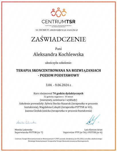 Jestem psychologiem, terapeutą TSR (Terapii Skoncentrowanej na Rozwiązaniach) oraz psychoterapeutą integracyjnym (w trakcie szkolenia). Obecnie realizuję 4-letnie akredytowane szkolenie psychoterapeutyczne w Profesjonalnej Szkole Psychoterapii w Instytucie Psychologii Zdrowia w Warszawie. Zajmuje się też diagnozą ADHD u osób dorosłych. Doświadczenie kliniczne zdobyłam na Oddziale Ogólnopsychiatrycznym w Mazowieckim Specjalistycznym Centrum Zdrowia (tzw. Szpital Tworkowski). Wsparcie psychologiczne oferuję klientom we współpracy z gabinetami prywatnymi oraz w ramach projektów finansowanych ze środków publicznych. Podczas spotkań tworzę bezpieczną, pełną empatii i zrozumienia przestrzeń. Nie narzucam gotowych rozwiązań – wspólnie szukamy najlepszych sposobów na odzyskanie wewnętrznej równowagi i sprawczości. Wspieram między innymi osoby, które: - zmagają się z depresją, lękiem, stresem, wypaleniem zawodowym - doświadczają trudności w relacjach, mają niską samoocenę i brak pewności siebie - dorastały w rodzinach dysfunkcyjnych (DDD/DDA) i chcą przepracować trudne doświadczenia - chcą lepiej zrozumieć siebie i odnaleźć sens w swoim życiu - chcą dokonać zmian w swoim życiu i szukają możliwości pokonania różnych trudności - dostrzegają u siebie trudności związane z ADHD Moją pracę opieram na doświadczeniu i wiedzy, którą pozyskałam w trakcie studiów na Uniwersytecie Łódzkim (psychologia), w Instytucie Psychologii Zdrowia (psychoterapia), Centrum Terapii Skoncentrowanej na Rozwiązaniach, Uniwersytecie SWPS (nowoczesne doradztwo zawodowe i coaching) oraz podczas licznych kursów i szkoleń o tematyce psychologicznej. Poza terapią indywidualną oferuję również: - doradztwo zawodowe: jeśli zastanawiasz się, jak odnaleźć swoje miejsce na rynku pracy lub zmienić ścieżkę kariery razem zrozumiemy Twoje mocne strony i opracujemy plan, który opiera się na solidnym rozumieniu Twoich predyspozycji i celów - konsultacje rozwojowe: jeśli chcesz lepiej poznać siebie i czujesz, że chcesz więcej od życia, ale nie wiesz, jak to osiągnąć, podczas sesji rozwojowej pomogę Ci zaplanować kolejne kroki, które zaprowadzą Cię do pożądanych zmian Prowadzę terapię indywidualną dla dorosłych i młodych dorosłych (osoby powyżej 18 roku życia). Na doradztwo zawodowe zapraszam osoby od 13 roku życia (7-8 klasa). Oferuję spotkania zarówno stacjonarnie, jak i online. Swoją pracę poddaję regularnej superwizji, dbając o najwyższy standard udzielanej pomocy psychologicznej.
