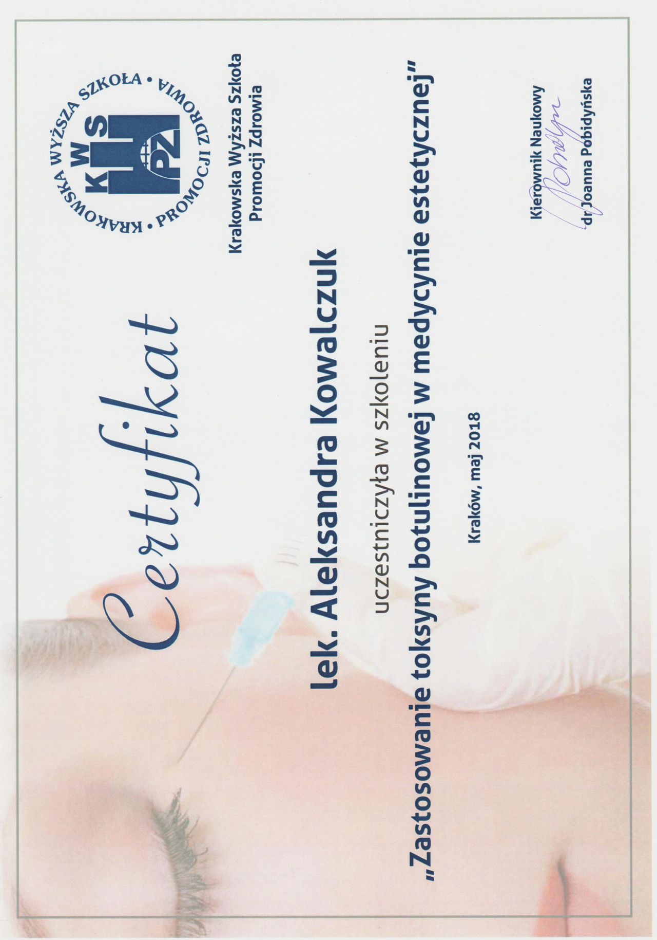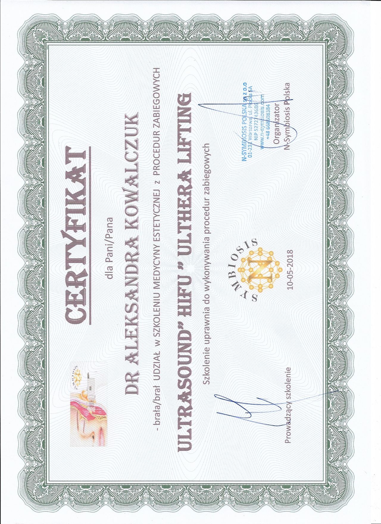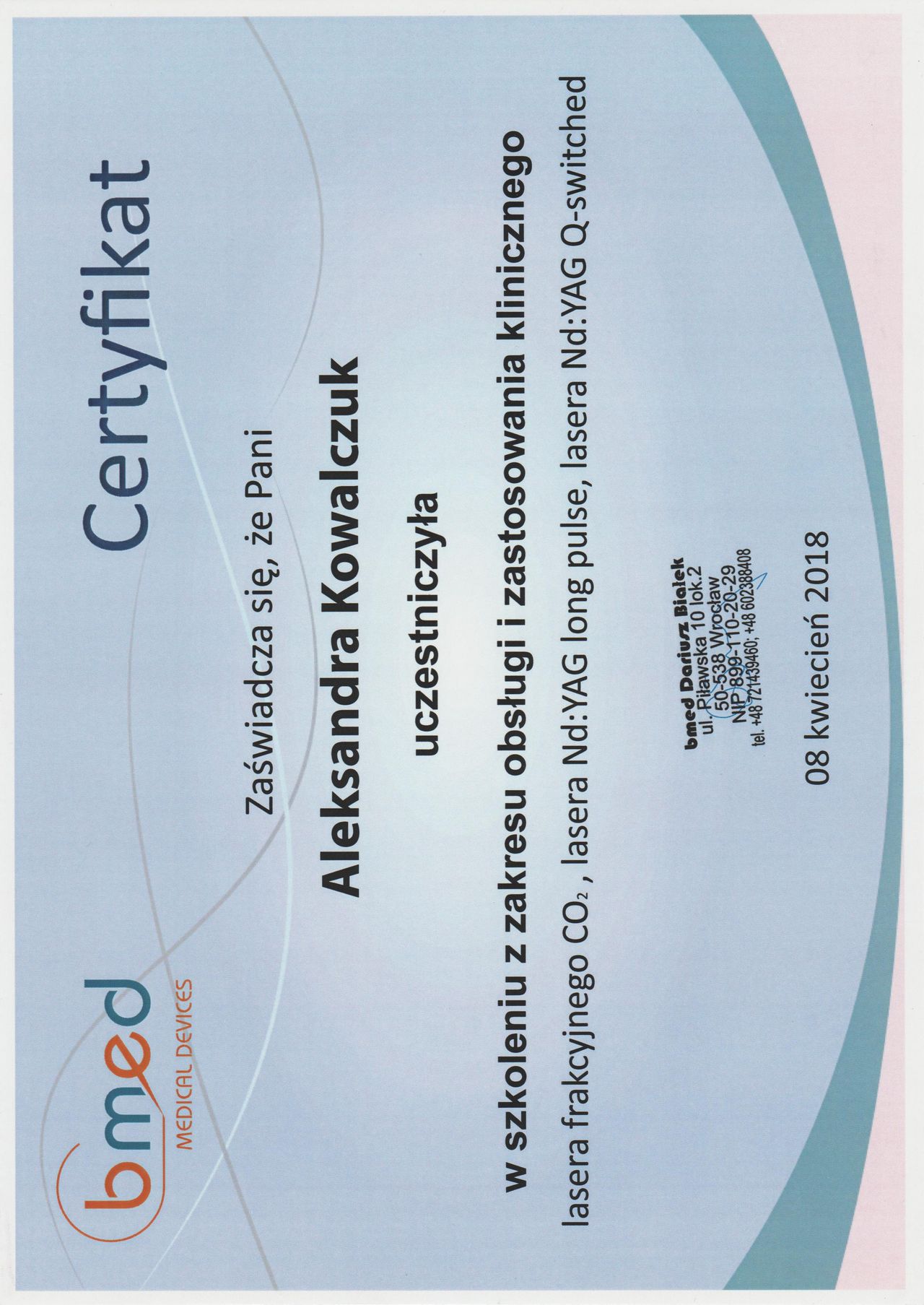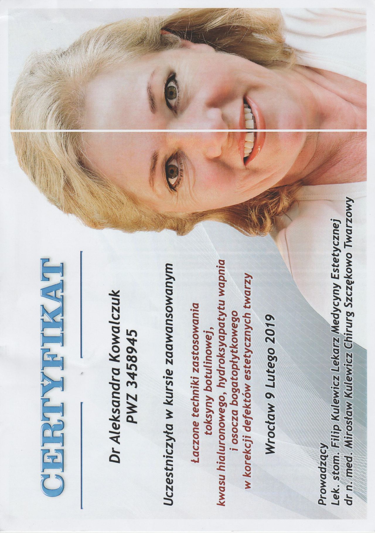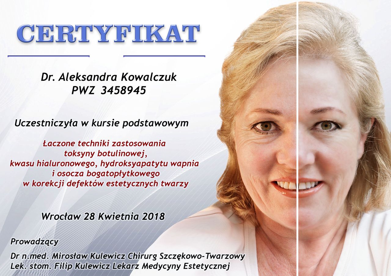 Posiadam potwierdzone licznymi certyfikatami uprawnienia do przeprowadzania zabiegów z wykorzystaniem toksyny botulinowej, stymulatorów, mezoterapii, wypełnień kwasem hialuronowym, w tym skronie, nos, usta, wolumetria, a także systemów laserowych - lasera ablacyjnego CO2, lasera Q-Switch, lasera Picosekundowego, systemu skoncentrowanych fal ultradźwiękowych Ulthera (HIFU), zabiegów z zastosowaniem generatora plazmy (Plasmage), jak również lasera Alma IPL Dye-VL i karboksytarapii.