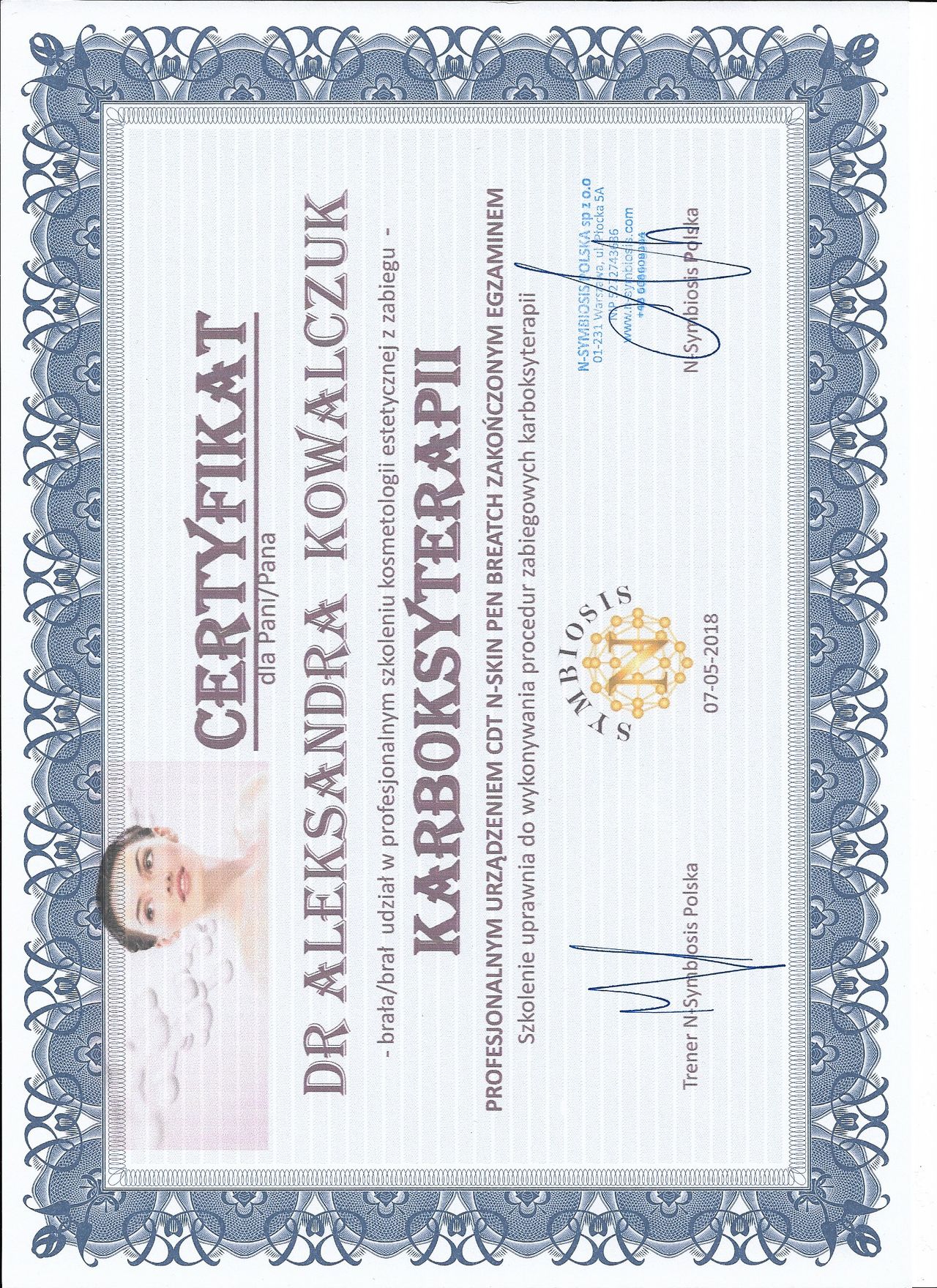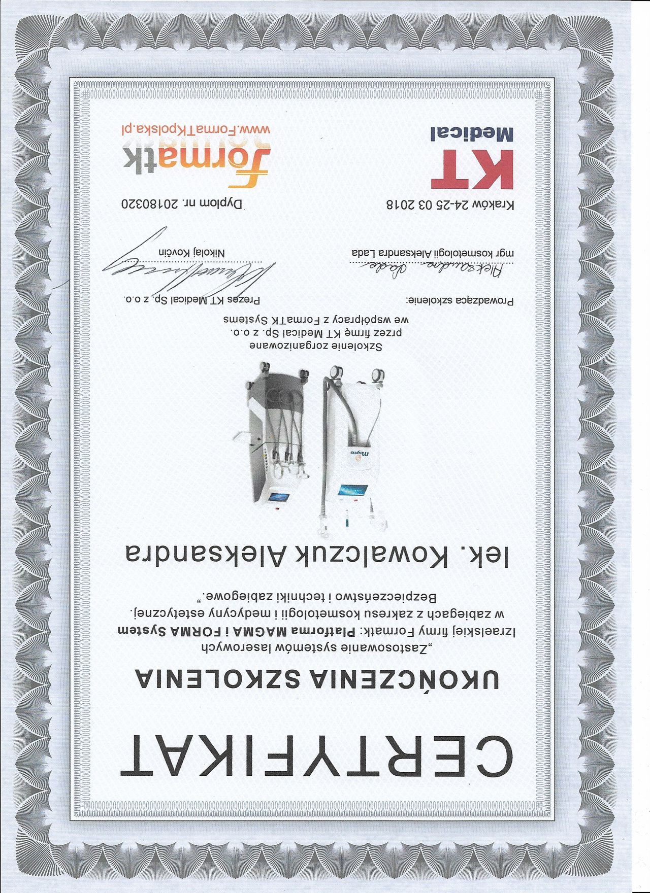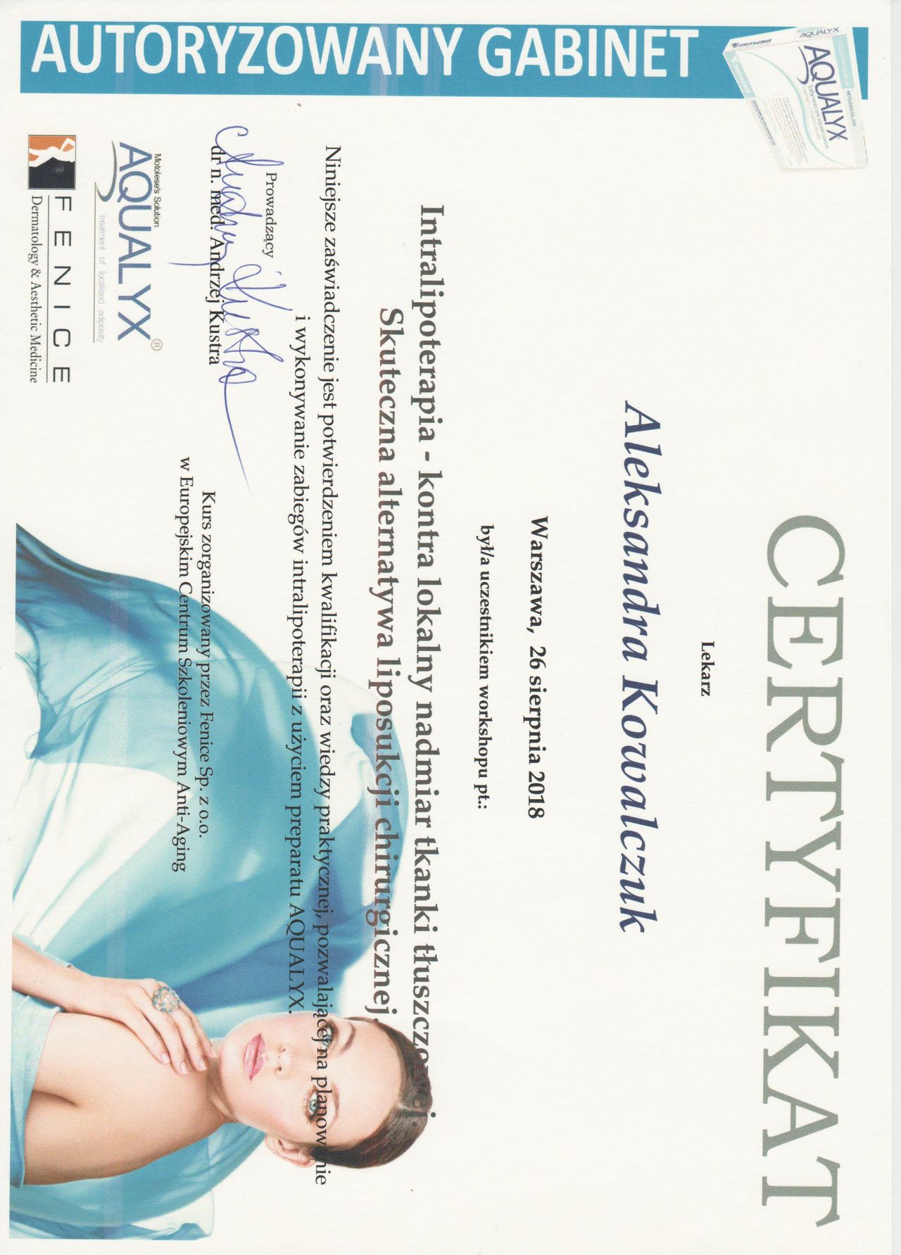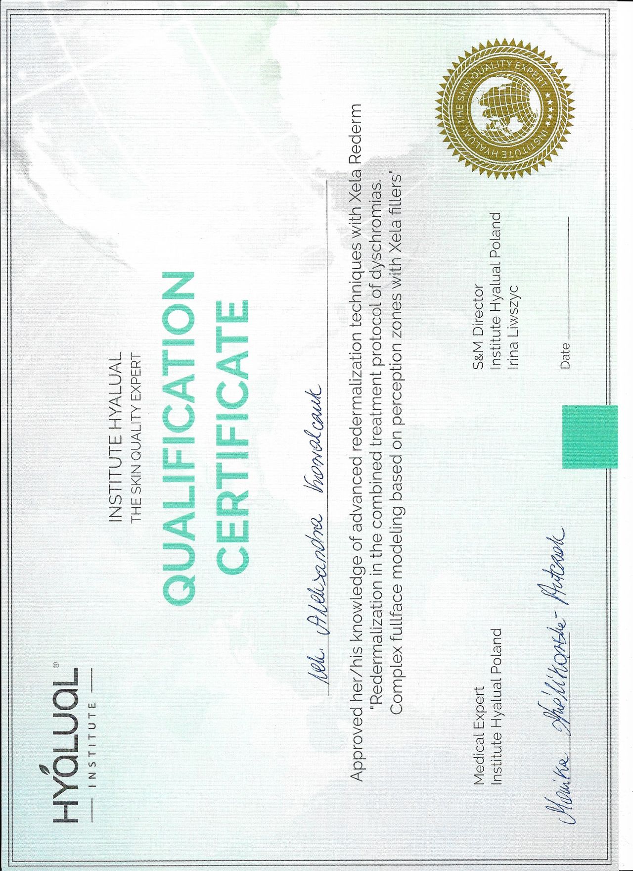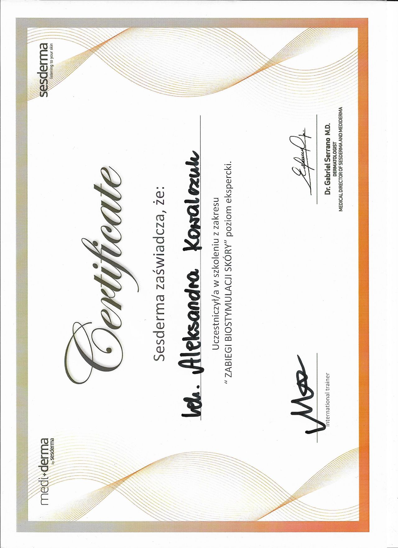 Posiadam potwierdzone licznymi certyfikatami uprawnienia do przeprowadzania zabiegów z wykorzystaniem toksyny botulinowej, stymulatorów, mezoterapii, wypełnień kwasem hialuronowym, w tym skronie, nos, usta, wolumetria, a także systemów laserowych - lasera ablacyjnego CO2, lasera Q-Switch, lasera Picosekundowego, systemu skoncentrowanych fal ultradźwiękowych Ulthera (HIFU), zabiegów z zastosowaniem generatora plazmy (Plasmage), jak również lasera Alma IPL Dye-VL i karboksytarapii.