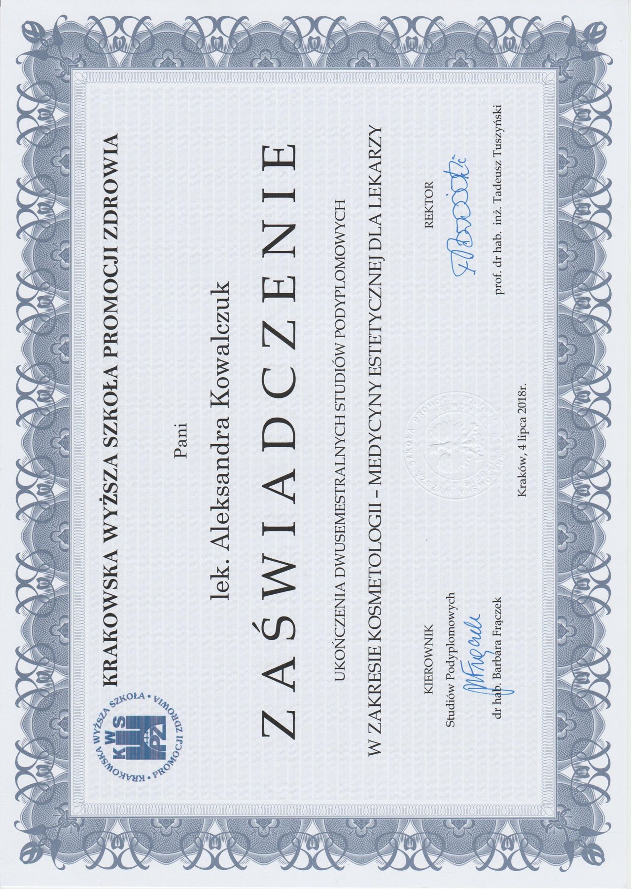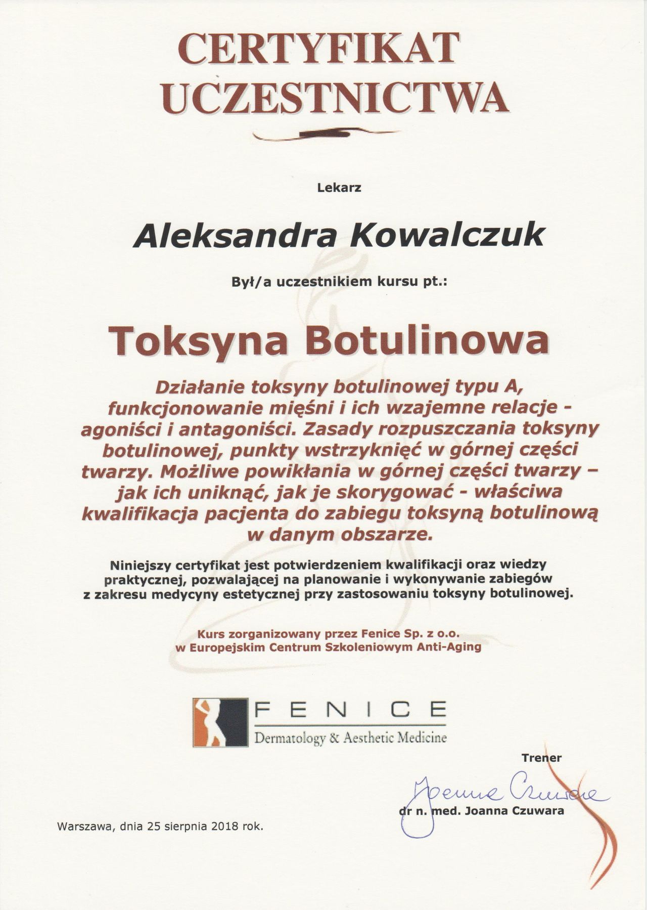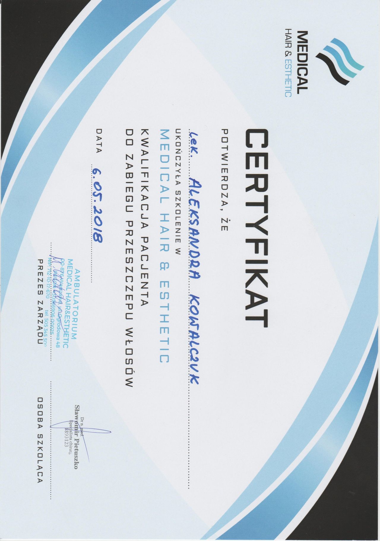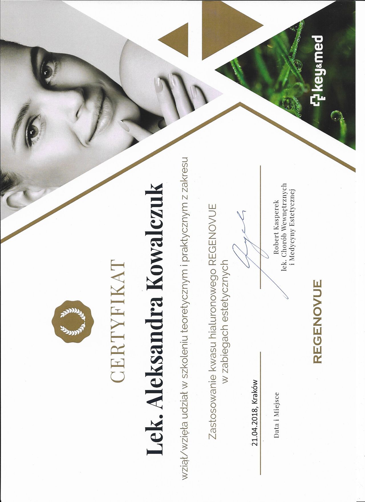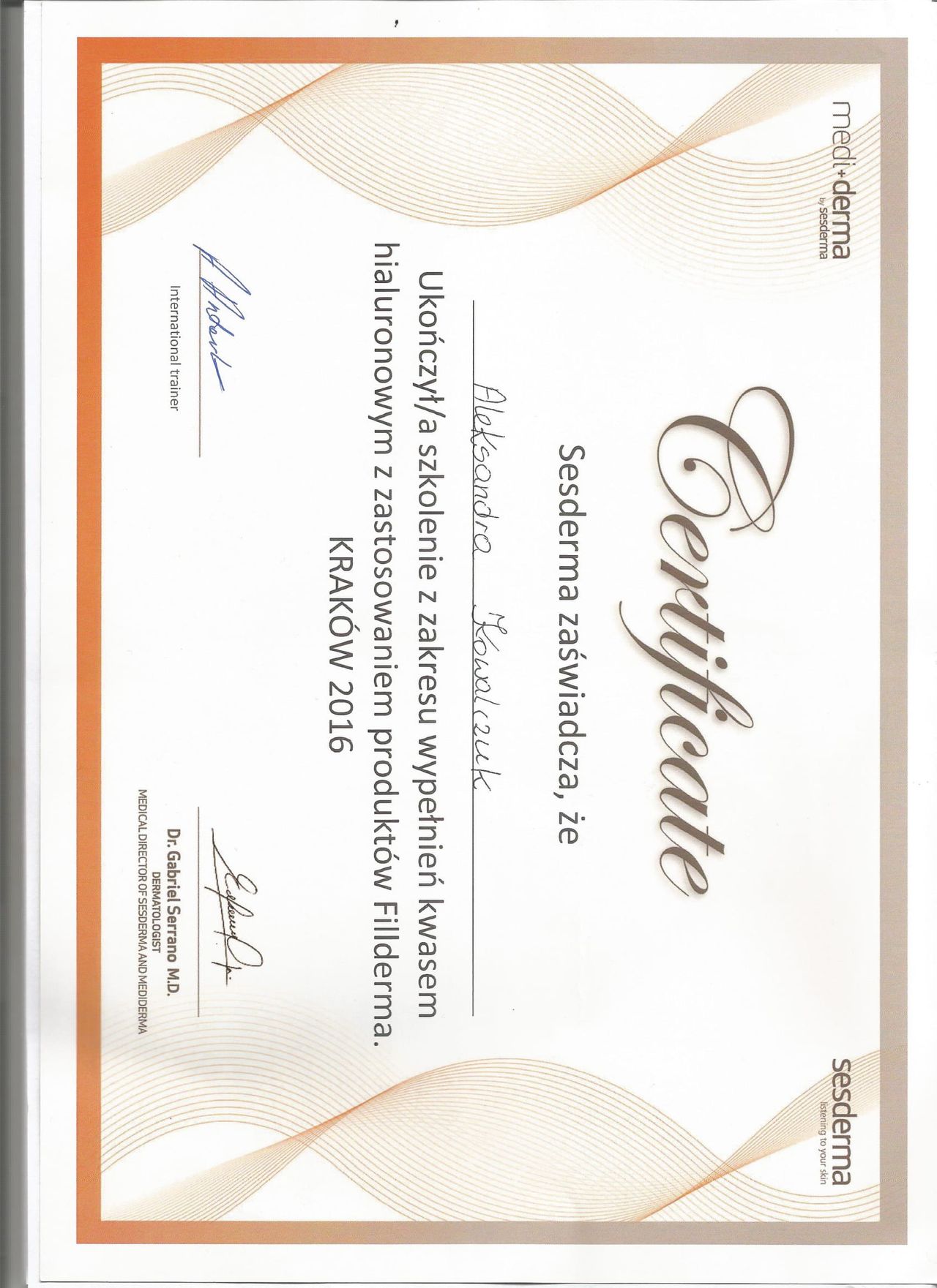 Posiadam potwierdzone licznymi certyfikatami uprawnienia do przeprowadzania zabiegów z wykorzystaniem toksyny botulinowej, stymulatorów, mezoterapii, wypełnień kwasem hialuronowym, w tym skronie, nos, usta, wolumetria, a także systemów laserowych - lasera ablacyjnego CO2, lasera Q-Switch, lasera Picosekundowego, systemu skoncentrowanych fal ultradźwiękowych Ulthera (HIFU), zabiegów z zastosowaniem generatora plazmy (Plasmage), jak również lasera Alma IPL Dye-VL i karboksytarapii.