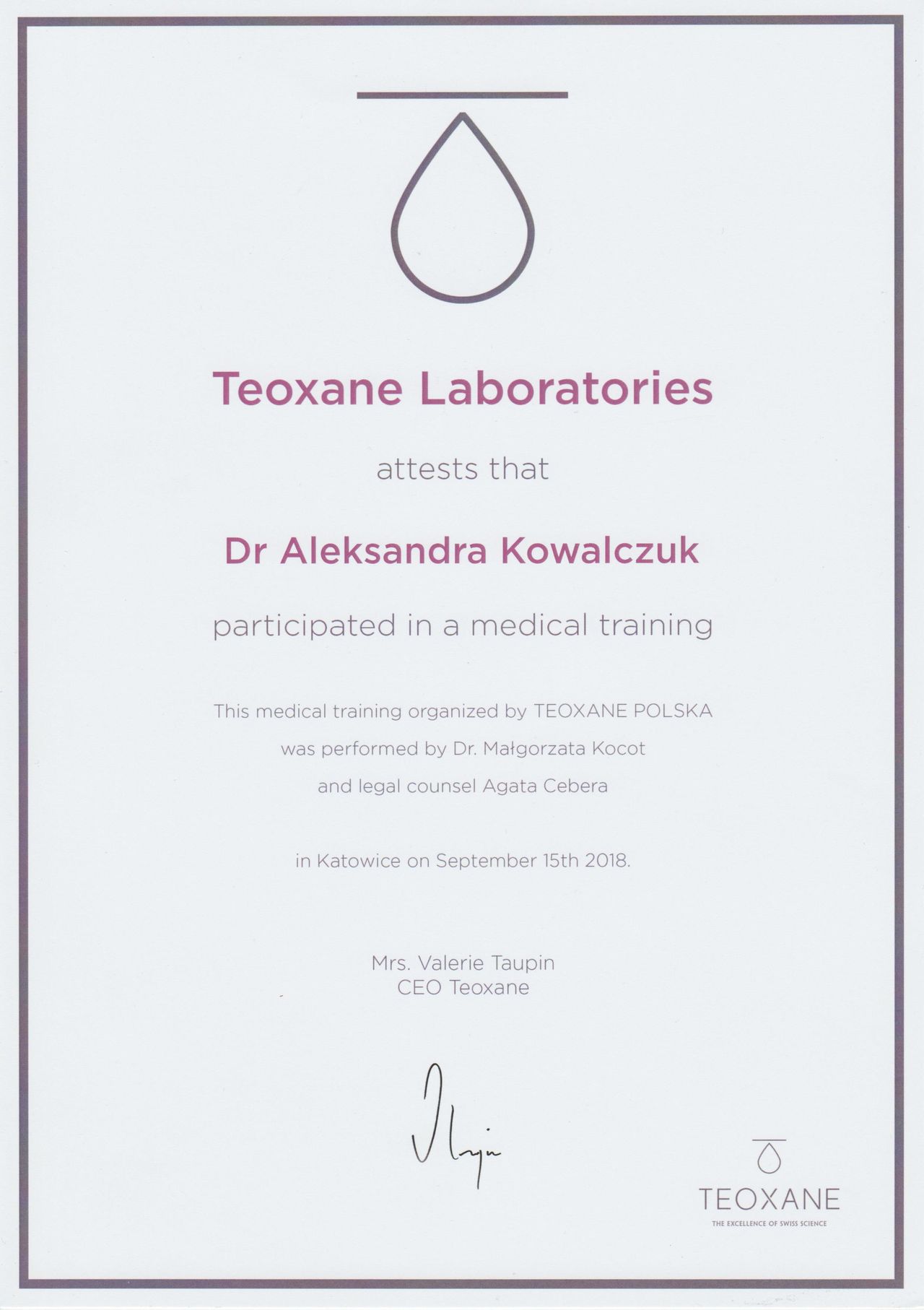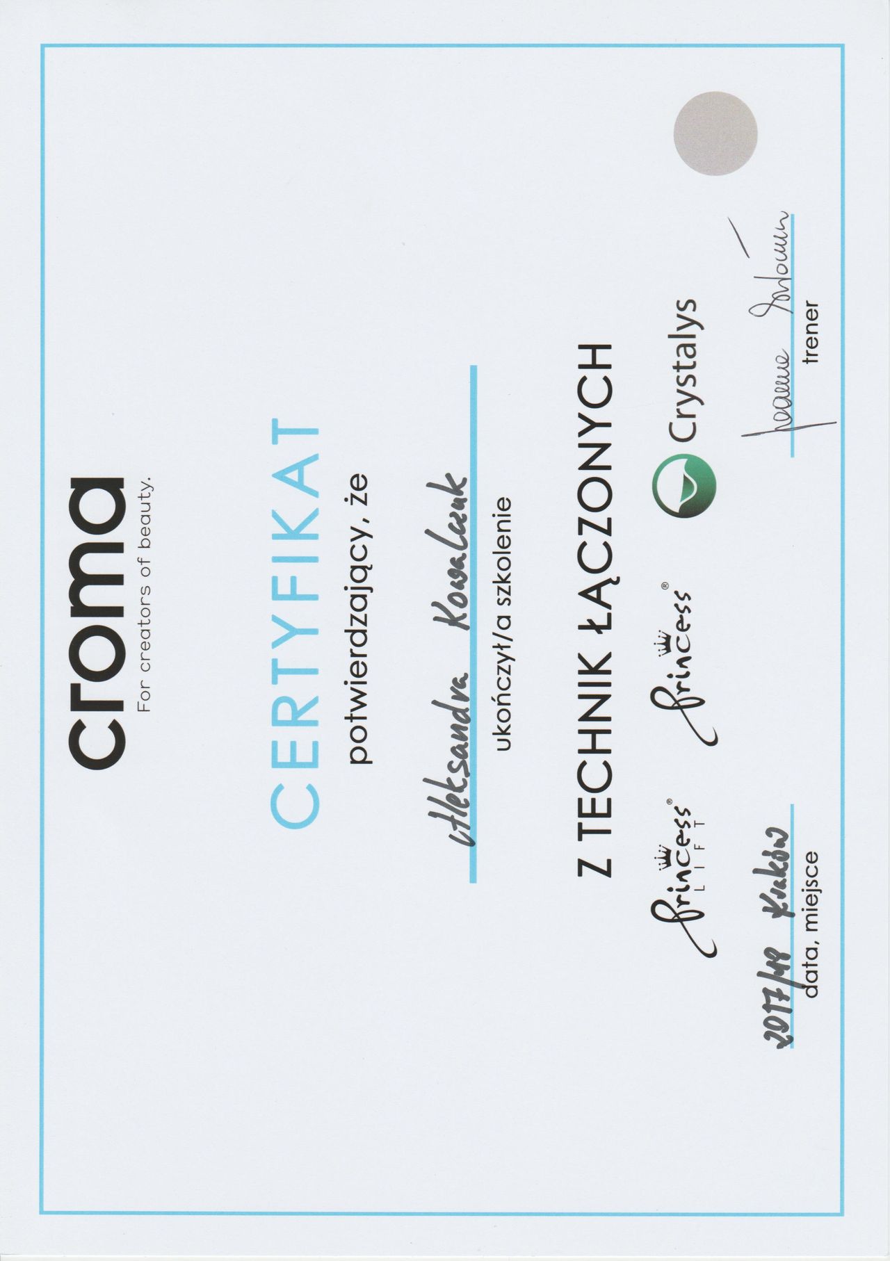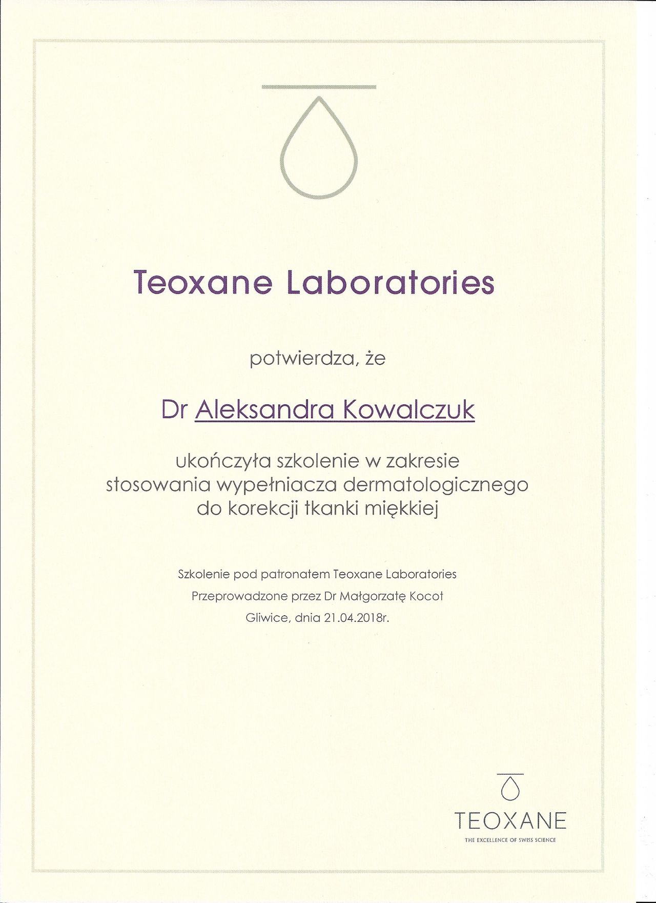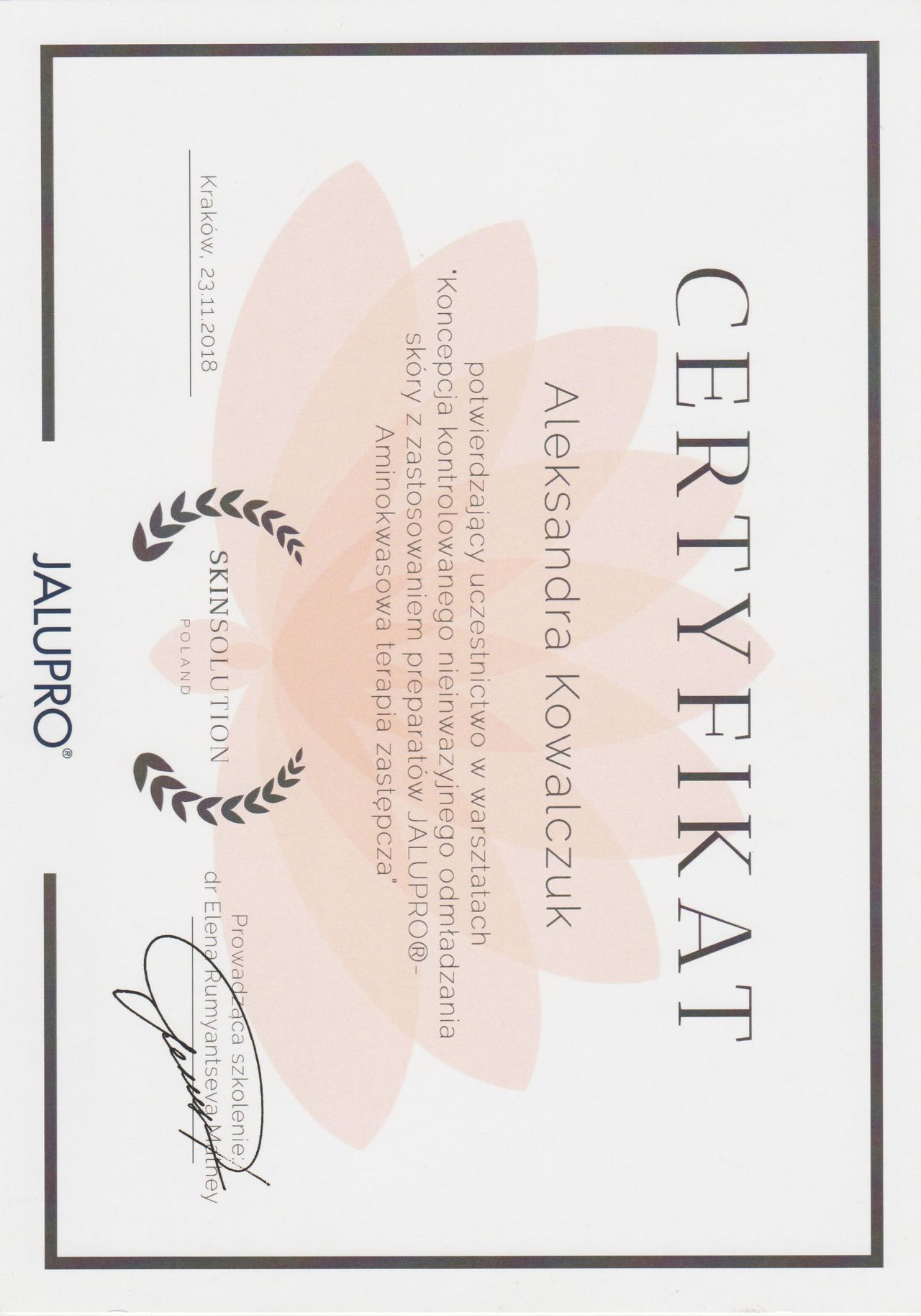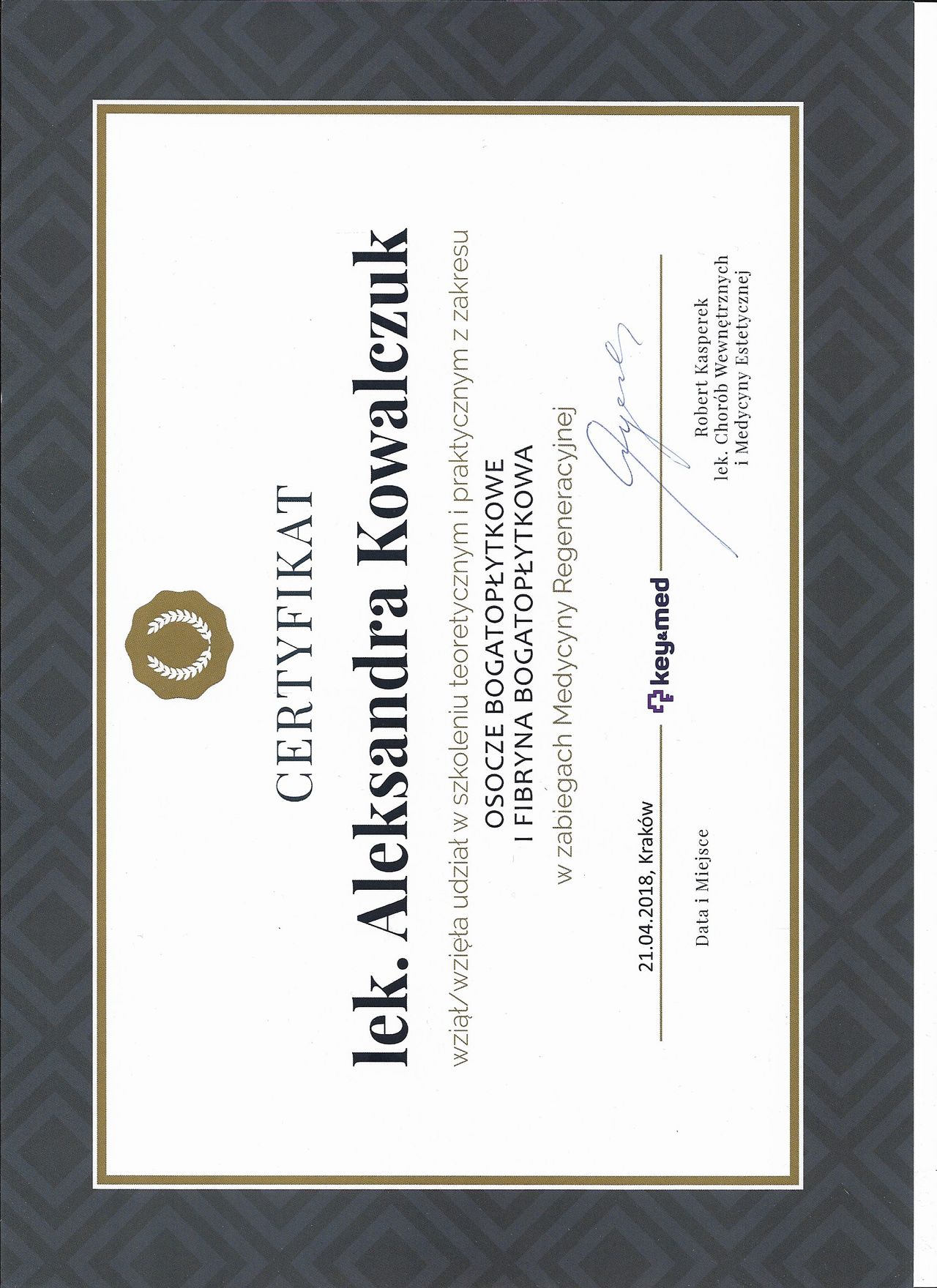 Posiadam potwierdzone licznymi certyfikatami uprawnienia do przeprowadzania zabiegów z wykorzystaniem toksyny botulinowej, stymulatorów, mezoterapii, wypełnień kwasem hialuronowym, w tym skronie, nos, usta, wolumetria, a także systemów laserowych - lasera ablacyjnego CO2, lasera Q-Switch, lasera Picosekundowego, systemu skoncentrowanych fal ultradźwiękowych Ulthera (HIFU), zabiegów z zastosowaniem generatora plazmy (Plasmage), jak również lasera Alma IPL Dye-VL i karboksytarapii.
