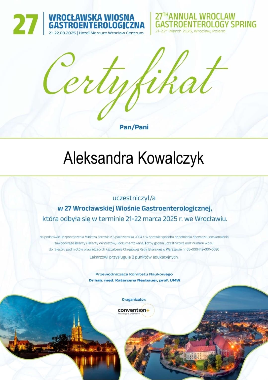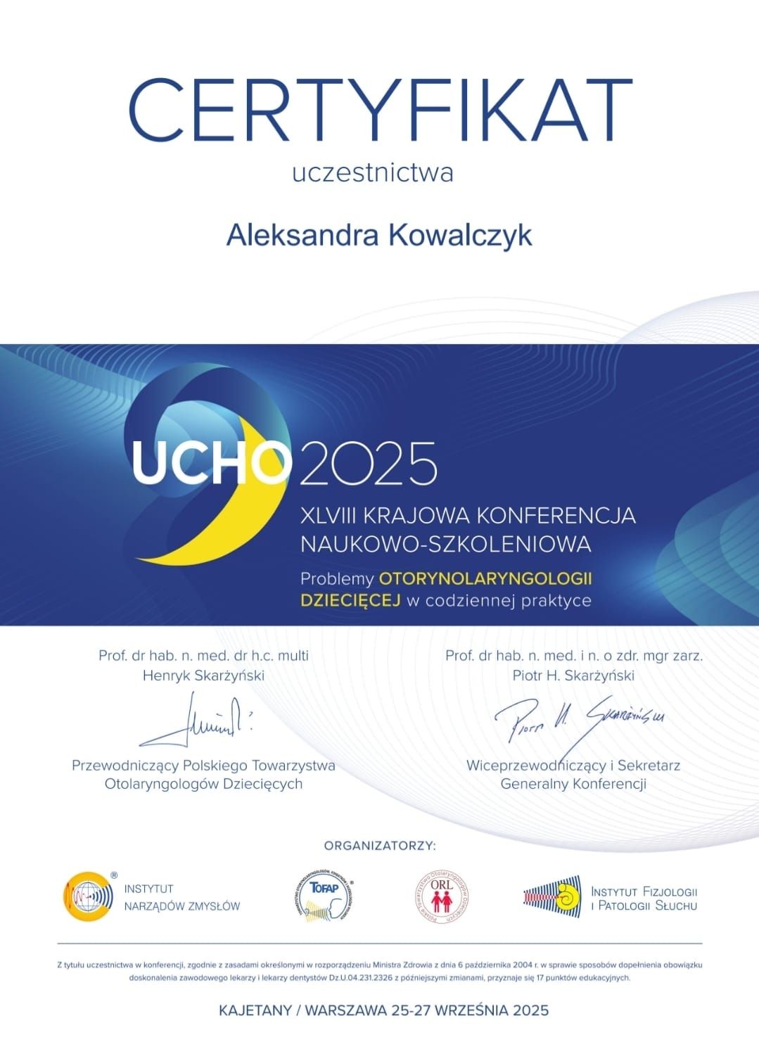 Jestem lekarzem specjalistą otorynolaryngologii, audiologii i foniatrii oraz lekarzem dentystą. Zajmuję się w leczeniem chorób uszu, zatok, nosa, gardła i krtani u dzieci i dorosłych. Jestem absolwentką wydziału lekarskiego i lekarsko- stomatologicznego Akademii Medycznej we Wrocławiu. Od 2011 roku pracuję w Oddziale Laryngologicznym w Wojewódzkim Szpitalu Specjalistycznym we Wrocławiu, początkowo na stanowisku młodszego asystenta, a po zdaniu Państwowego Egzaminu Specjalizacyjnego i uzyskaniu tytułu specjalisty – na stanowisku starszego asystenta. Swoje doświadczenie zawodowe zdobywałam m.in. podczas dyżurów medycznych, a także pracując w Poradniach Specjalistycznych i gabinecie stomatologicznym. W latach 2018-2019 byłam lekarzem konsultującym w programie Profilaktyki Nowotworów Głowy i Szyi przy Dolnośląskim Centrum Onkologii we Wrocławiu. W 2019 roku rozpoczęłam szkolenie z zakresu audiologii i foniatrii, zdając egzamin specjalizacyjny wiosną 2024 roku. Jako laryngolog zajmuję się diagnostyką i leczeniem (zarówno zachowawczym jak i operacyjnym) chorób uszu, nosa, zatok przynosowych, gardła, krtani oraz zaburzeń słuchu i zawrotów głowy. Szczególnie interesuje mnie połączenie stomatologii i laryngologii oraz interdyscyplinarne leczenie wczesne i podejście holistyczne. Poza zakresem świadczeń zdrowotnych na bieżąco aktualizuję swoją wiedzę i biorę udział w licznych konferencjach i szkoleniach krajowych i międzynarodowych z zakresu otorynolaryngologii, chirurgii głowy i szyi oraz audiologii i foniatrii. Jestem Członkiem Polskiego Towarzystwa Otolaryngologów Chirurgów Głowy i Szyi.