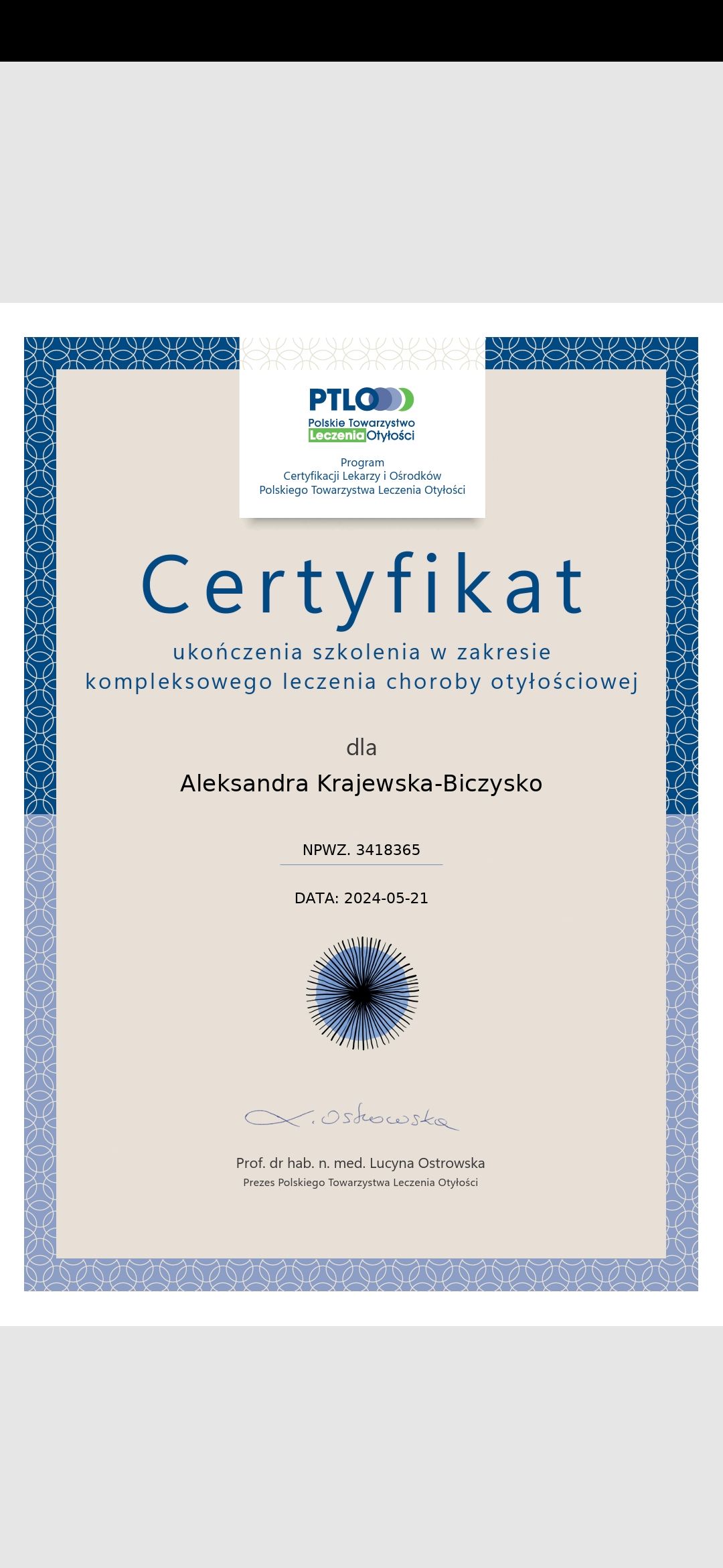 Posiada certyfikat Polskiego Towarzystwa Leczenia Otyłości.
