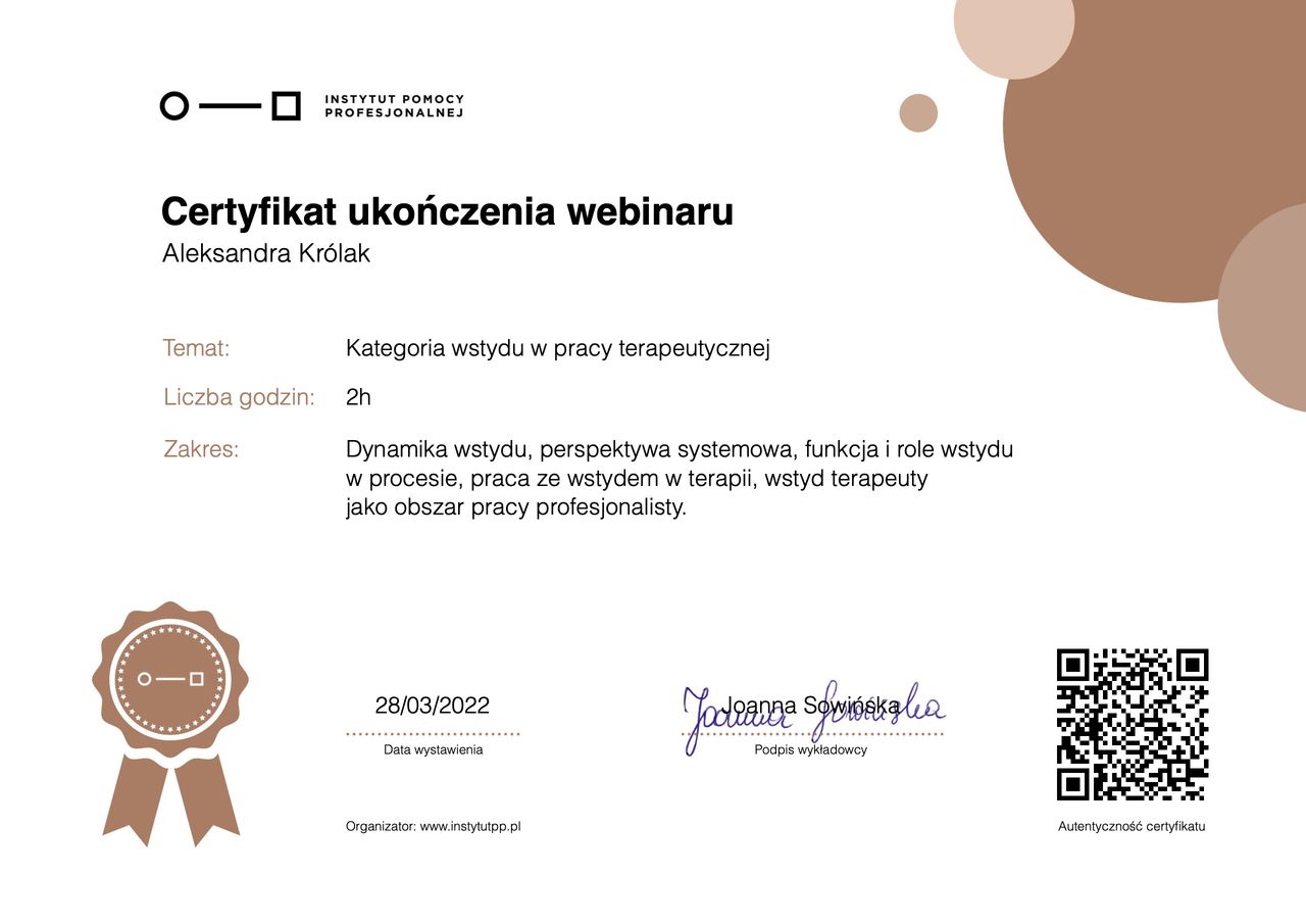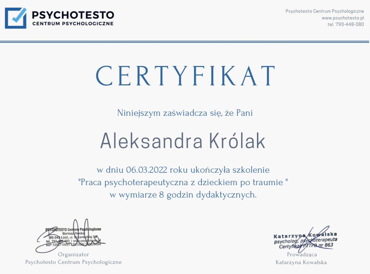 Jestem psycholożką oraz interwentką kryzysową. Ukończyłam jednolite studia magisterskie z psychologii (specjalność zdrowia i kliniczna), Studium Terapii Dzieci i Młodzieży oraz Roczny Kurs Interwencji Kryzysowej. Obecnie jestem w trakcie całościowego szkolenia z psychoterapii poznawczo-behawioralnej (2. rok).