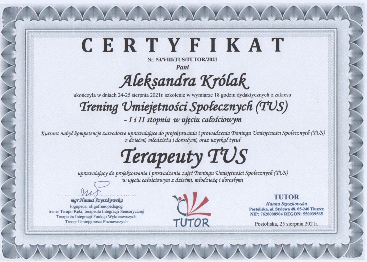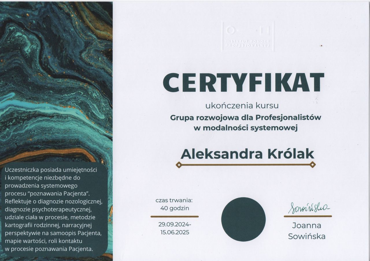 Pracuję pod stałą superwizją oraz regularnie dbam o własny rozwój zawodowy.