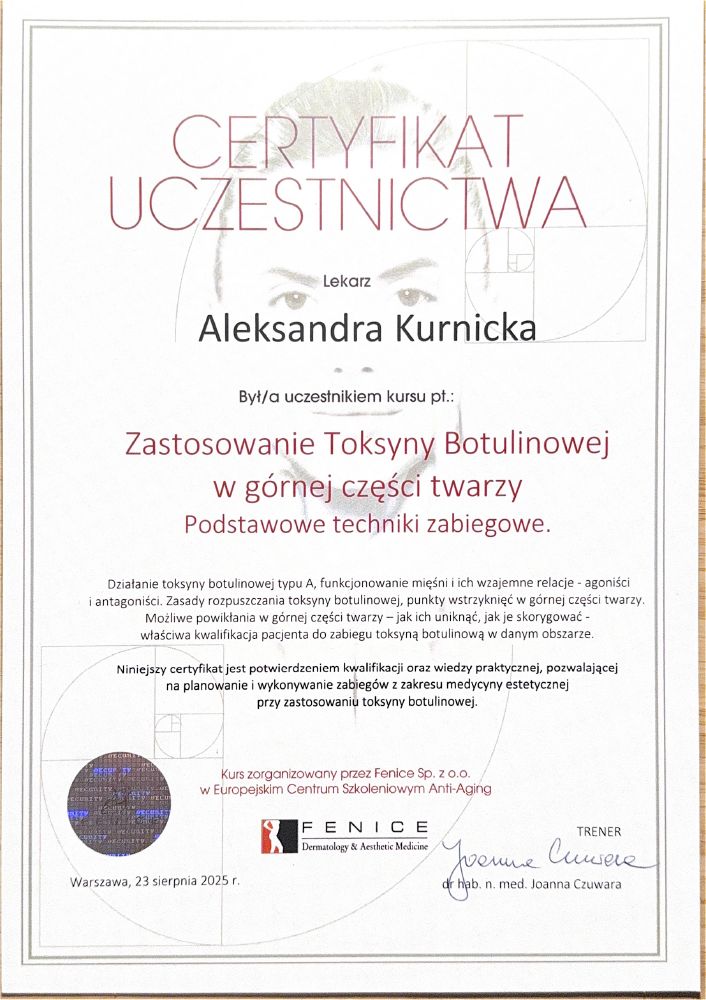lek. Aleksandra Kurnicka jest lekarzem w trakcie specjalizacji z okulistyki, obecnie na ostatnim roku szkolenia specjalizacyjnego, po zdanym egzaminie specjalizacyjnym. Przyjmuje pacjentów w NAOKU Clinic w Radomiu, gdzie zajmuje się diagnostyką okulistyczną, prowadzeniem pacjentów przewlekle chorych oraz konsultacją stanów ostrych w okulistyce.