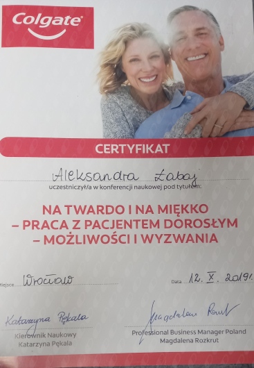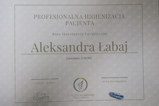 Z dużym zaangażowaniem i dokładnością wykonuję zabiegi higienizacji. W mojej pracy liczy się aby Pacjent czuł się komfortowo, skupiając się jednocześnie na wykonaniu pracy z najwyższą delikatnością. Stale podnoszę swoje kwalifikacje uczestnicząc w kursach i szkoleniach.