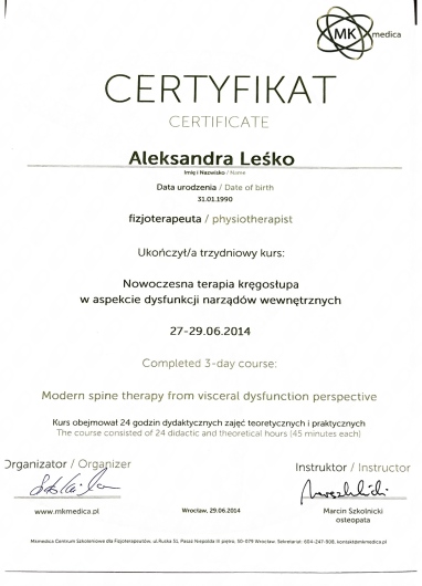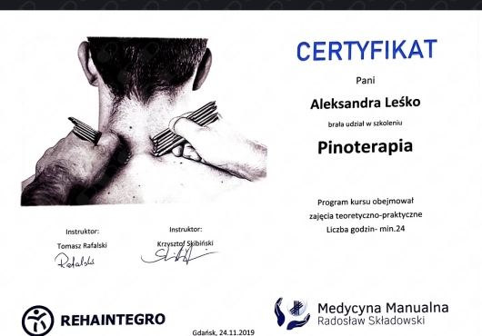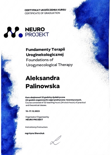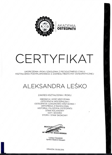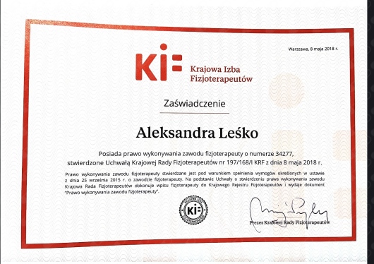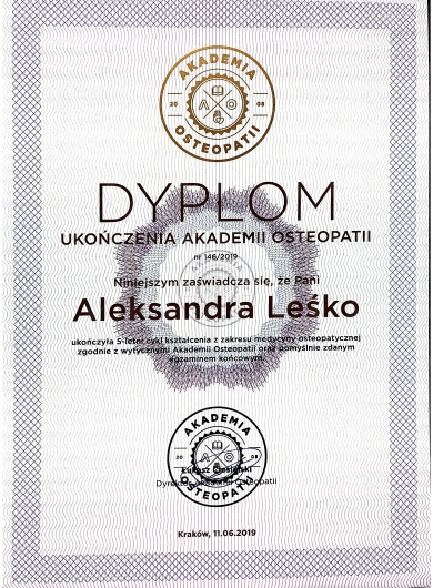 Jaki jest zakres porad oferowanych przez Aleksandra Leśko-Palinowska?Aleksandra Leśko-Palinowska to osteopata, fizjoterapeuta. Na podstawie swojego doświadczenia i wykształcenia Aleksandra Leśko-Palinowska oferuje usługi takie jak: Terapia manualna, terapia kobiet w ciąży, terapia przeciwbólowa, konsultacja fizjoterapeutyczna, kinesiotaping, osteopatia, osteopatia dziecięca, fizjoterapia kobiet w ciąży / fizjoterapia okołoporodowa, fizjoterapia uroginekologiczna.