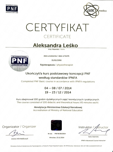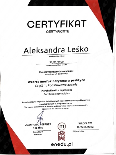 Jestem fizjoterapeutką i osteopatką z wieloletnim doświadczeniem w pracy z dorosłymi i dziećmi. Ukończyłam Wydział Fizjoterapii Akademii Wychowania Fizycznego we Wrocławiu, Akademię Osteopatii w Krakowie oraz College of Cranial-Sacral Therapy. Stale poszerzam swoją wiedzę, uczestnicząc w szkoleniach z zakresu terapii manualnej, pracy powięziowej i podejścia holistycznego.