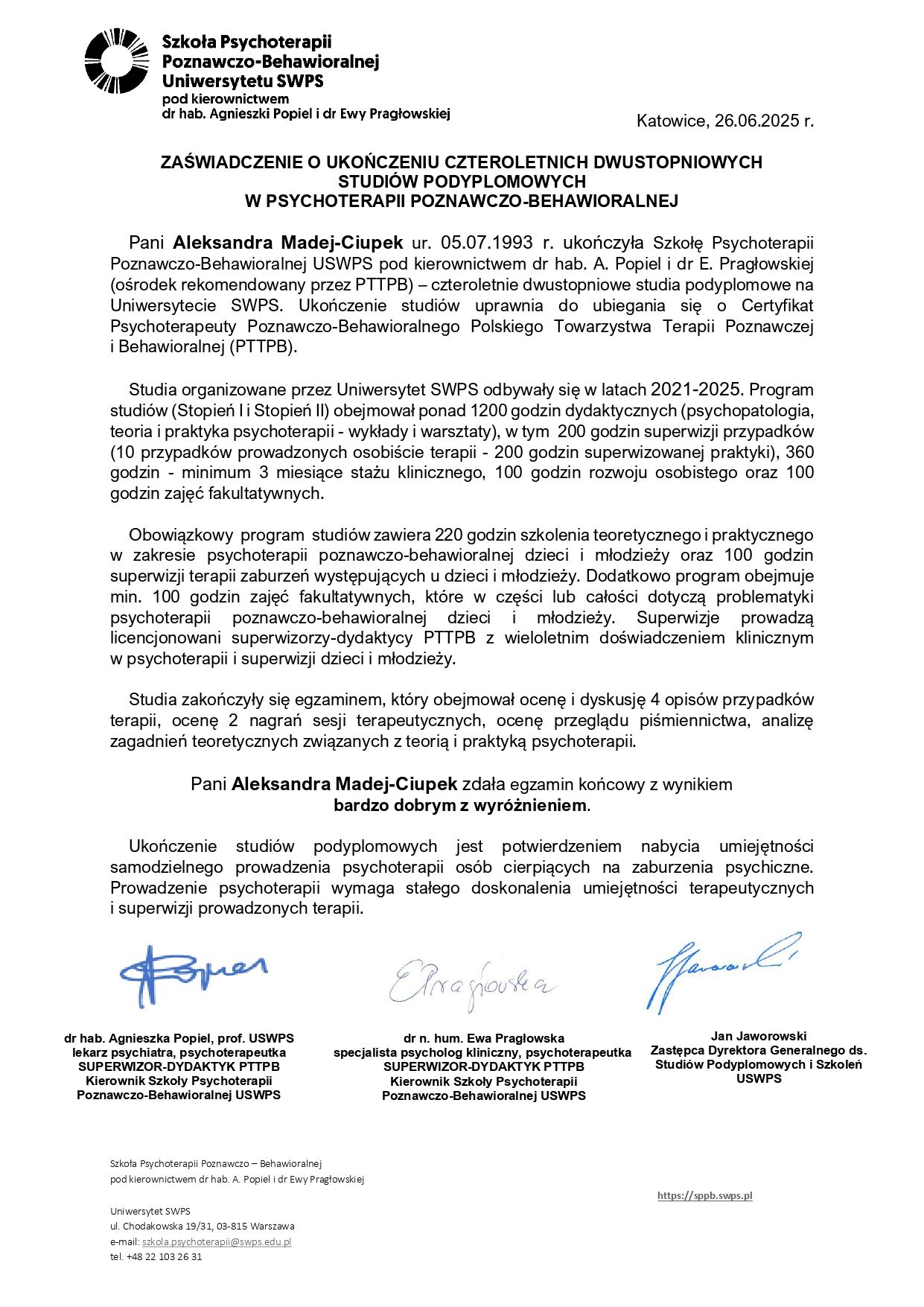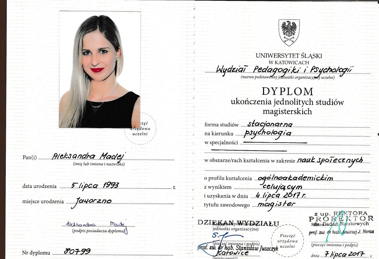 Jestem psycholożką i psychoterapeutką poznawczo-behawioralną, absolwentką psychologii na Uniwersytecie Śląskim w Katowicach (studia ukończyłam z wynikiem celującym) oraz 4-letnich studiów podyplomowych w Szkole Psychoterapii Poznawczo-Behawioralnej Uniwersytetu SWPS (studia podyplomowe ukończyłam z wyróżnieniem). Zdałam egzamin certyfikacyjny i obecnie oczekuję na wydanie formalnego zaświadczenia. Jestem członkinią Polskiego Towarzystwa Psychoterapii Poznawczo-Behawioralnej, posiadam również uprawnienia w zakresie przygotowania pedagogicznego oraz do prowadzenia badań w zakresie psychologii transportu.